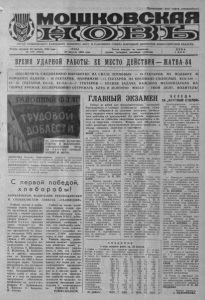 Пролетарии всех стран, соединяйтесь! ОРГАН МОШКОВСКОГО РАЙОННОГО КОМИТЕТА КПСС И РАЙОННОГО СОВЕТА НАРОДНЫХ ДЕПУТАТОВ НОВОСИБИРСКОЙ ОБЛАСТИ Газета основана 23 августа 1931 года № 105 (4915) СРЕДА, ' I Газета выходит по вторникам, 1 ЦЕ НА 29 августа 1984 года. j средам, четвергам, пятницам:, субботам. | 1 К О П. ВРЕМЯ УДАРН( )Й РАБОТЫ: ЕЕ МЕСТО ДЕЙСТВИЯ — ЖАТВА-84 — __ __ __ __ _ __ __ __ ____ _ _ ОБЕСПЕЧИТЬ ЕЖЕДНЕВНУЮ ВЫРАБОТКУ: НА СВАЛЕ ЗЕРНОВЫХ - 16 ГЕКТАРОВ, НА ПОДБОРЕ И ОБМОЛОТЕ ВАЛКОВ — 16 ГЕКТАРОВ, НАПРЯМУЮ —11 ГЕКТАРОВ, НА КОСОВИЦЕ СИЛОСНЫХ КСК-100 — 12—15 ГЕКТАРОВ, КС-1,8, КС-2,6—5—7 ГЕКТАРОВ — БОЕВАЯ ЗАДАЧА КАЖДОГО МЕХАНИЗАТОРА НА УБОРКЕ УРОЖАЯ. БЕСПЕРЕБОЙНО ОТГРУЖАТЬ ХЛЕБ И ЗЕЛЕНУЮ МАССУ - ТВОЙ ДОЛГ, ВОДИТЕЛЬ! ЗА ОТЛИЧНОЕ КАЧЕСТВО РАБОТЫ И ВЫСОКОПРОИЗВОДИТЕЛЬНЫЙ ТРУД НА У Б О Р К Е УРОЖАЯ ПОДНЯТ В ЧЕСТЬ: ДЕНИСОВА Николая Анатольевича, водителя автомашины колхоза «Ленинец», занятого вывозкой зеленой массы на силос и выполняющего сменную норму выработки на 180 процентов. ШИФЕЛЬБАЙНА Андрея Васильевича, механизатора совхоза «Томиловский», ведущего косовицу силосных и выполняющего сменное задание на 160 и более процентов. На его счету 2142 тонны накошенной зеленой массы. С первой победой, х л е б о р о б ы ! КОМБАЙНЕРАМ, ВОДИТЕЛЯМ, РУКОВОДИТЕЛЯМ И СПЕЦИАЛИСТАМ СОВХОЗА «ГАЛИНСКИЙ». Райком партии и райисполком горячо поздравляют тружеников вашего хозяйства с первой трудовой победой в развернувшейся уборке урожая — выполнением п л а н а продажи зерна государе т в у. На Мошковское хлебоприемное предприятие из совхоза поступило 3500 центнеров ржи. Она полностью убрана с 420 гектаров. В этом большая заслуга механизаторов А. Инякина, А. Клочкова, А. Шакурова, А. Жадченко, В. Ермоленко и других, выдавших уже из бункеров своих комбайнов по 1000 и более центнеров зерна. Средняя урожайность его составила по 16—17 центнеров с гектара. Бесперебойную отгрузку хлеба с поля на ток и с тока на приемное предприятие обеспечили прибывшие на п о м о щ ь шоферы Р. Дубинников, К. Верясов, С. Бояркин, М. Сяткин, Сейчас на полях хозяйства полным ходом продолжается уборка других зерновых, силосных культур. Райком КПСС, райисполком с удовлетворением восприняли сообщение о том, что хлеборобы вашего совхоза также успешно справятся с заданием поставки 11 000 центнеров зерна в счет кооперации. Райком партии, райисполком желают труженикам хозяйства новых успехов, выражают уверенность в том, что партийная, профсоюзная и комсомольская организации, руководители и специалисты примут все меры для организованного проведения уборки урожая, завершения ее в сжатые сроки и без потерь, для выполнения социалистических обязательств по продаже государству продукции земледелия и животноводства. РАЙКОМ КПСС. РАЙИСПОЛКОМ. ГЛАВНЫЙ ЭКЗАМЕН Сейчас не время для продолжительных заседаний. Руководители и главные специалисты совхоза «Смоленский» собираются на утренние планерки, по-быстрому подводят итоги прошедшего дня, согласовывают свои действия на предыдущий. По просьбе корреспондента одна из субботних оперативок превратилась в беседу за «круглым столом». Вопрос для обсуждения один: насколько подготовленным вступило хозяйство в уборку зерновых, силосны: Директор совхоза И. П. ЮЗОВ сказал: — Уборочная прошлого года выявила наши организационные промахи, когда вся ответственность за су дьбу урожая была возложена только на 