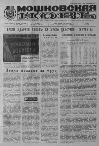ОРГАН МОШКОВСКОГО РАЙОННОГО КОМИТЕТА КПСС и районного совета народных депутатов новосибирской области Газета основана 23 августа 1931 года 1 № 105 (4915) J ЧЕТВЕРГ, 30 августа 1984 года. Газета выходит по вторникам, Ц Е Н А средам, четвергам, пятницам, субботам. 1 КОП . ВРЕМЯ УДАРНОЙ РАБОТЫ: ЕЕ МЕСТО ДЕЙСТВИЯ— ЖАТВА 84 з а о т л и ч н о е к а ч е с т в о | р а б о т ы и вы с о к о п р ои з в о д и т е л ь н ы й т р у д НА У Б О Р К Е УРОЖАЯ ПОДНЯТ в ЧЕСТЬ: СЕМЕНОВА Владимира Ефимовича, механизатора совхоза «Смоленский», занятого на косовице силосных и добившегося выполнения сменной нормы выработки на 245 процентов. Безнарядным з в е н о м В колхозе «Союз строителей» 480 гектаров силосных из 800 закреплено за безнарядным звеном В. Зинкевича. В звене девять человек. Они торопятся убрать кукурузу до заморозков и до начала теребления льна, которым занято 160 гектаров. К 28 августа звено скосило силосные с 70 гектаров и заложило в траншеи 21330 центнеров зеленой массы. Соблюдение технологии выращивания позволило получить неплохой урожай. Пока каждый гектар дает около 300 центнеров зеленой' массы. Силосные комбайны водят А. и Ю. З и н к е в и ч и , КСК-100 — В. Вороно в . Г. Мамаев и В. Григорьев на тракторных тележках отвозят массу с поля к траншее. Земля Солнечный а ' в г у стовский день. На поляне готовые к нелегкой битее за урожай выстроились в ряд комбайны. А напротив, как бы в ожидании команды, автомобили. Торжественная праздничная обстановка. Об этом говорит и стол, накрытый красной скатертью, букет цветов на нем. Сюда собрались те, кто сегодня на полях совхоза «Мошков- гкий» ведет борьбу за хлеб, за то, чтобы убрать его вовремя и без потерь, — комбайнеры, шоферы, обслуживающий персонал. Здесь руководители и специалисты хозяйства, гости. Какие чувства испытывают в этот волнующий момент перед началом жатвы ее участники? Мы беседуем с молодым механизатором Н. А. Штоппелем: — Второй сезон буду работать на комбайне,— рассказывает он. — В прошлую уборку решил попробовать... Понравилось. Н а м о л отил 4000 центнеров зерна. Хорошо освоил свою «Ниву», узнал слабые места. Нынче ремонтировал ее сам, устранил те не- пбладки, которые мешали в 1983 году. Старался тщательно подготовить комбайн, ведь уборка будет нелегкой. В прошлом году в это время весь горох в совхозе был уже скошен, убирали ячмень. А нынче только еще начинаем. Хлеба подошли поздно и неравномерно, полегли. Но мы готовы к трудностям, на легкую жатву и не расчитывали. Техника глодаюсь, не подведет. Опыт у меня небогатый, но старшие товарищи всегда помогут. Настроение боевое, урожай неплохой. Главная задача — убрать весь хлеб. Время уходит. Поэтому надо с первого дня работать на совесть. Стоявшие рядом с нами механизаторы включились в разговор. Как сделать так, чтобы провести жатву успешно и не допустить потерь —. этот вопрос ио-настоящему волнует каждого из них. Выжидать невоз даст когда. Нужно убирать полным ходом, считают о;., я. Но хлеба р а з н ы е , И КалСдилЛ ПОЛЮ следует подходить по-особому — выбирать направление движения комбайна, регулировать высоту среза, вынос мотовила в зависимости от полег- лости хлебов. Сейчас выйдем на горох. Здесь стеблеподъемники не нужны. В этом убедились, когда опробовали технику, — рассуждают комбайнеры. — А вот на других зерновых без них не обойтись. Трудиться будем весь световой день, в поле выезжать, как и ра