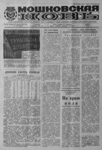 Пролетарии всех стран, соединяйтесь! ношновсняя ОРГАН МОШКОВСКОГО РАЙОННОГО КОМИТЕТА КПСС и районного совета народных депутатов новосибирской области Газета основана 23 августа 1931 года № 106 (4916) СУББОТА, 1 сентября 1984 года. Газета выходит по вторникам, средам, четвергам, пятницам, субботам. Ц Е Н А 1 КОП. 2 СЕНТЯБРЯ - ДЕНЬ РАБОТНИКОВ lillllllil считаясь з а о т л и ч н о е к а ч е с т в о р а б о т ы и в ы с о к о п р ои з в о д и т е л ь н ы й ТРУД НА У Б О Р К Е УРОЖАЯ ПОДНЯТ В ЧЕСТЬ: Звена комбайнеров из совхоза «Мошковский» (звеньевой МА- РАНДИН Виктор Прокопьевич). Этот коллектив, занятый косовицей гороха, добился выполнения сменной нормы выработки на 211 процентов. Звена комбайнеров из совхоза «Сокурский» (звеньевой член КПСС ФИЛИПЧИК Григорий Петрович), которое на подборке овса перевыполняет сменное задание в два с лишним раза. ДНЕВНИК УБОРКИ УРОЖАЯ С В Е Д Е Н И Я о ходе полевых работ на 31 августа 1 графа — хозяйство, 2— скошено зерновых (га), 3— в процентах к плану, 4— обмолочено зерновых (га), 5-— в процентах к плану, 6— скошено силосных (га), 7 8— поднято зяби (га), 9— в процентах к плану. « Белоярский» 152 30 112 22 20 40 0 0 «Барлакский» 452 23 360 18 362 28 459 12,7 «Сокурский» 587 23 206 8 260 35 68 2,5 «Зеркальный» 155 22 6о 9 250 63 225 17 «Ояшинский» 750 18 101 2,4 217 36 168 4,4 «Галинский» 651 16 470 12 178 16 0 0 «Ленинец» 400 14 250 9 100 12,5 70 2 «Большевик» 257 13 56 3 63 16 61 2,6 «Мошковск.» 862 11 131 1,7 275 25 174 2,2 «Союз строит.» 280 10 207 8 138 17 80 2,4 «Томиловск.» 294 8 53 1,5 247 31 0 0 «Восход» 436 7 187 3 340 31 378 6,5 «Смоленский» 128 6 75 3,5 145 15 182 5,6 «Сосновский» 186 4 26 0,6 164 23 102 2,5 По району: 5590 12,4 2299 5,1 2758 25 1964 4 30 августа зерновые в районе скошены на 926 гектарах, что на 281 гектар больше, чем в предыдущий день. Однако дневная расчетная норма выполнена лишь наполовину. В совхозах «Галинский», «Зеркальный», «Белоярский» выработка состава ла соответственно 74, 72 и 67 процентов к плановой, а в большинстве других хозяйств — 30—50 процентов. С каждым днем растет объем работ на обмолоте. Но темпы его низки. К 31 августа зерновые в районе подобраны и обмолочены с 2299 гектаров, что составляет 5,1 процента к плану. В совхозах «Ояшинский», «Мошковский» хлеба в валках для их подбора уже на три дня работы при плановой производительности. Однако за 30 августа она составила в названных хозяйствах соответственно лишь 18 и 28 процентов от расчетной. Низкие темпы уборки хлебов связаны с тем, что 30 августа, например, в поле работал только 141 зерновой комбайн вместо 277, предусмотренных планом. Лучше, чем у других, в последние дни идут дела у земледельцев совхоза «Сокурский». Так, 30 августа выработка на косовице зерновых у них составила 130 п р о ц е н т о в , на обмолоте — 73 процента к расчетной. Чтобы ускорить подбор валков и добиться плановой ежедневной прибавки, здесь необходимо вывести в поле незадействованные пока еще 6 комбайнов. 30 августа замедлилась уборка силосных культур. Они скошены на 372 гектарах вместо плановых 500, В совхозе «Большевик» и колхозе «Ленинец», например, эта работа выполнена соответственно на 8, 20 гектарах при норме 24, 42 гектара. В этот день лишь механизаторы совхозов «Сокурский», «Восход», «Ояшинский» добились расчетной прибавки. На уборке силосных лидируют полеводы совхоза «Зеркальный», где эти культуры скошены на 63 процентах занятых ими площадей. С каждого гектара получено в среднем по 210 центнеров зеленой массы. Наивысшая урожайность силосных пока в колхозе «Союз строителей» — 260 це