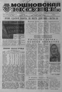 ОРГАН МОШКОВСКОГО РАЙОННОГО КОМИТЕТА” КПСС И РАЙОННОГО СОВЕТА НАРОДНЫХ ДЕПУТАТОВ НОВОСИБИРСКОЙ ОБЛАСТИ Пролетарии всех стран, соединяйтесь! чя Газета основана 23 августа 1931 года № 107 (4917) ВТОРНИК, 4 сентября 1984 года. Газета выходит по вторникам, средам, четвергам, пятницам, субботам. Ц Е Н А 2 К 0 П. .ВРЕМЯ УДАРН( )Й РАБОТЫ: Е: Е МЕСТО ДЕЙСТВИЯ —ЖАТВА-84 ВЫСОКОПРОИЗВОДИТЕЛЬНЫЙ ТРУД НА У Б О Р К Е УРОЖАЯ ПОДНЯТ В ЧЕСТЬ: СЕПТА Якова Христиановича, комбайнера совхоза «Смоленский», занятого обмолотом гороха и добившегося перевыполнения сменной нормы выработки почти в три раза. МОНГОЛИНА Александра Александровича, комсомольца, механизатора колхоза «Ленинец», ведущего косовицу силосных и выполняющего сменное задание на 190 процентов. ВАСИЛЬЕВА Василия Васильевича, водителя автомашины совхоза «Зеркальный», выполняющего на вывозке зеленой массы сменную норму на 180 процентов. i -. ДНЕВНИК УБОРКИ УРОЖАЯ С В Е Д Е Н И Я 0 ходе полевых работ на 3 сентября 1 графа — хозяйство, 2— скошено зерновых (га), 3- — в процентах к плану, 4— обмолочено зерновых (га), 5 — в процентах к плану, ь— скошено силосных (га), 7— в процентах к плану, м— поднято з л о й (га), 9— в процентах к плану. «Зеркальный» 258 37 100 14 295 73,7 235 18 «Белоярский» 175 35 175 35 25 50 22 3,5 «Барлакский» 663 33 436 22 555 42,5 601 16,7 «Ленинец» 884 32 474 17 200 25,0 100 2,8 «Сокурский» 773 31 420 17 329 43,9 146 5,4 «Большевик» 497 25 157 8 102 25,5 97 4,2 «Ояшинский» 960 23 289 7 300 50 181 4,8 «Галинский» 775 19 619 15 273 24,8 0 0 « М о ш к о е с к и й » 1256 16 296 4 450 40,9 377 4,9 «Смоленский» 290 14 145 7 250 26,3 194 6 «Томиловский» 493 14 215 6 335 41,9 0 0 «Союз строит.» 342 12 207 8 202 25,2 80 2,4 «Восход» 648 11 332 5 451 41,0 401 6,9 «Сосновский» 240 6 101 2 240 33,8 102 2.5 По району: 8254 18,2 4043 8,9 4007 36 ,8 2536 5,1 Истекли еще три дня жатвы, в течение которых стояла прекрасная погода. Но сделано за это период гораздо меньше предусмотренного планом. Зерновые за 31 августа — 2 сен- тяоря в районе скошены на 2664 гектарах вместо намеченных 5400 , то есть выработка составила всего 49 процентов от расчетной. Лишь комбайнеры колхоза «Ленинец» выполняли дневное задание в среднем на 130—140 процентов. В остальных хозяйствах не достигли плановой производительности. Так, в колхозе «Союз строителей» и совхозе «Сосновский» дневная норма на косовице зерновых выполнялась на 15 процентов, в совхозах «Белоярский», Галинский», «Смоленский», «Мошковский» соответственно на 26, 30, 40, 40 процентов. Еще хуже обстоят дела на обмолоте. Выработка по району составила в указанные дни 21 процент к расчетной. За этот период зерновые обмолочены на 1644 гектарах при плане на 3 дня 2590 гектаров. В колхозе «Союз строителей», по оперативным данным, не было прибавки. В совхозе «Сосновский» дневная норма на обмолоте выполнялась в среднем на 21 процент. Ненамного выше этот показатель в совхозах «Смоленский», «Мошковский». Комбайнеры совхоза «Сокурский» дневное задание выполняли на 80 процентов, в совхозе «Белоярский» и колхозе «Ленинец» —на 55 и 47 процентов. В остальных хозяйствах производительность ниже 45 процентов от расчетной. В указанные три дня немного повысилась выработка нй уборке силосных культур. Расчетная норма выполнялась в среднем на 83 процента. Силосные скошены на 1248 гектарах при нлане на три дня 1500 гектаров. В совхозе «Барлакский» прибавка была на 12 процентов выше плановой. В совхозах «Восход», «Мошковский», «Сокурский» она составила 92 процента к расчетной. Снизились темпы уборки силосных в совхозе 
