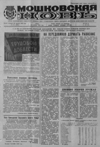 Пролетарии всех стран, соединяйтесь ОРГАН МОШКОВСКОГО РАЙОННОГО КОМИТЕТА КПСС и р а й о н н о г о с о в е т а н а р о д н ы х д е п у т а т о в н о в о с и б и р с к о й о б л а с т и Газета основана 23 августа 1931 года СРЕДА, Газета выходит по вторникам, Ц Е Н А № 111 (4921) 12 сентября 1984 года. средам, четвергам, пятницам, субботам. 1 К О П . С 10 ПО 20 СЕНТЯБРЯ -УДАРНЫЙ ДЕКАДНИК ПО УВЕЛИ ЧЕНИЮ ТЕМПОВ УБОРКИ ЗЕР НОВЫХ, ЗАСЫПКИ СЕМЯН, ЗАВЕРШЕНИЮ КОСОВИЦЫ СИЛОСНЫХ КУЛЬТУР. Звена комбайнеров из совхоза «Сокурский» (звеньевой ШВЕЦОВ Владимир Анатольевич). Этот коллектив на косовице пшеницы добился перевыполнения сменной нормы выработки к с лишним раза. в два ЖЕЛИБЫ Анатолия Ивановича, тракториста совхоза «Зеркальный», занятого вывозкой зеленой массы и выполняющего гмен ное задание на 230 и более процентов. КОНДРАТЬЕВА Григория Кирилловича, механизатора совхоза «Ьарлакский», ведущего подъем зяби и выполняющего avrem-rvir норму на 160 и более процентов. Выполняя первую заповедь КОМБАЙНЕРАМ, ВОДИТЕЛЯМ, РУКОВОДИТЕЛЯМ И СПЕЦИАЛИСТАМ СОВХОЗА «СМОЛЕНСКИЙ» Райком партии и райисполком горячо поздравляют коллектив вашего хозяйства с трудовой победой в нынешней жатве — выполнением плана продажи зерна государству. На Мошковское хлебоприемное предприятие на 9 сентября совхозом сдано 5150 центнеров зерна при плане 4000 центнеров. Достижению этого успеха способствовала ударная работа комбайнеров Я. X. Септа, выдавшего из бункера своего комбайна более 3000 центнеров зерна, В. Н. Исакова, намолотившего око- ло центнеР °в хлеба и уложившего его в валки более чем на 100 гектарах, А. М. Потапова, А. П. Обухова, на счету каж- дого из которых более 1500 центнеров намолоченного зерна На 150— 170 процентов выполняют сменные задания занятые косовицей зерновых В. Л. Афанасьев, А. М. Файзрахманов А. С. Перкин. Хорошо трудятся водители автоколонны № 576 города Новосибирска В. И. Андреев, В. И. Морозов, В. И. Зо- лоторевич, Г. В. Веретин, которые добиваются выполнения сменной нормы при перевозке зерна с поля на хлебоприемное предприятие и ток на 180-200 процентов. Полеводы совхоза уверены в своих силах и способны справиться со всем комплексом уборочных работ. ^ Райком партии, райисполком желают труженикам хозяйства новых успехов, выражают уверенность в том, что коллектив совхоза сделает все для успешного проведения жатвы, недопущения потерь выращенного урожая и выполнения государственных планов. РАИНОМ КПСС. РАЙИСПОЛКОМ. Указ Президиума Верховного Совета РСФСР О ПРОВЕДЕНИИ ОЧЕРЕДНЫХ ВЫБОРОВ НАРОДНЫХ ЗАСЕДАТЕЛЕЙ РАЙОННЫХ (ГОРОДСКИХ) НАРОДНЫХ СУДОВ РСФСР В связи с истечением в октябре — ноябре 1984 года полномочий народных заседателей районных (городских) народных судов РСФСР Президиум Верховного Совета Российской Советской Федеративной Социалистической Республики постановляет: Президиумам Верховных Советов автономных, республик, исполнительным комитетам краевых, областных, Московского и Ленинградского городских Советов народных депутатов, исполнительным комитетам Советов народных депутатов автономных областей и автономных округов провести очередные выборы народных заседателей районных (городских) народных судов РСФСР в октябре — ноябре 1984 года. Председатель Президиума Верховного Совета РСФСР М. ЯСНОВ Секретарь Президиума Верховного Совета РСФСР X. НЕШКОВ Москва, 6 сентября 1984 года. НА ПЕРЕДОВИКОВ 