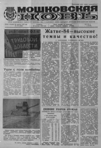 Пролетарии всех стран, соединяйтесь! ОРГАН МОШКОВСКОГО РАЙОННОГО КОМИТЕТА КПСС и районного совета народных депутатов новосибирской области Газета основана 23 августа 1931 года СУББОТА, Газета выходит по вторникам, Ц Е Н А № 118 (4928) 29 сентября 1984 года. 1 средам, четвергам, пятницам, субботам. 1 КОП . IIIЛИЛИН3А ОТЛИЧНОЕ КАЧЕСТВО |1ИннД|РАБ0ТЫ И ВЫСОКОПРО111111 тт 1|111|ИИ И 'изводительныи ТРУД ■ 1 IIP IM jl B f ш Н Д И К ' НА у ь О р к Е УРОЖАЯ ■ П Н f f i W I i t i i i l W £ : ‘ ‘ . ПОДНЯТ В ЧЕСТЬ: ГРЕБЕНЩИКОВА Василия Григорьевича — тракториста совхоза «Смоленский», занятого вспашкой зяби и выполняющего сменную норму выработки на 180 процентов,; ТИТОВА Сергея Степановича, механизатора совхоза «Восход», ведущего подъем зяби и выполняющего сменное, задание на 160 и более процентов. Ушли с поля комбайны После барлакцев — вторыми в районе т - завершили жатву-84 земледельцы совхоза «Белоярский». Зерновые убраны с 500 гектаров, силосные — с 50. Урожай порадовал: с каждого гектара получено)) по 17,7 центнера зерна. Это позволило выполнить план хлебосдачи более чем на 200 процентов, засыпать необходимое количество семян в 920 центнеров. Они отсортированы и сейчас ведется их дальнейшая подработка. Заканчивается сбор соломы с полей. Здесь место комбайнов заняли тракторы с плугами.. Вспахано более 270 гектаров зяби при плане 570 гектаров. В социалистическом соревновании среди • комбайнеров первое место занял С. Ворошнин, второе __ В. Догаев. Хорошо потрудился и А. Козлов. На| отвозке зерна от комбайнов отличились шоф е р ы А. Музыченко, В. Ковалер. Умело, по-хозяйски организовал работу на току его заведующий Г, Короткедич.] Но для белоярцев с завершением жатвы хлебов не убавилось осенних забот: на очереди) не менее ответственная пора — пушная жат в а — ведь звероводство основная отрасль этого хозяйства. Сейчас труженики совхоза ведут активную подготовку к забою зверей. Ровными рядами лежат хлебные) валки в поле. Идут по нему комбайны. Подборщики бережно подхватывают золотистую ленту из колосьев. И вот вымолоченное, налитое зерно) попадает в бункер. Так бункер за бункером набирает каждый из трех комбайнеров, что работают в звене А. Антошина из совхоза «Мош- ковский». По-ударному ведет жатву хлебов этот коллектив, по тысяче и более центнеров зерна выдает ежедневно. ★ ★ ★ На снимке: комбайн звеньевого в работе. Фото С, КАЗАКОВА, Жатве-84—высокие темпы и качество! С ЗАСЕДАНИЯ РАЙОННОГО ШТАБА В эти страдные, напряженные дни районный штаб по организации и проведен и ю уборки урожая регулярно рассматривает, анализирует и обсуждает ход жатвы, оперативно решает организационнопроизводственные вопросы, вырабатывает свои рекомендации, направления действия. Должная, принципиально острая оценка дается фактам раскачки, неорганизованности, из-за которых возникают сбои на том или ином участке полевого конвейера. В свое время за допущенную медлительность, непростительное выжидание, сдерживание темпов уборки урожая были заслушаны отчеты руководителей и специалистов ряда хозяйств, в том числе совхозов «Во с х о д», «Большевик», « С м о л е н ский», колхозов «Союз строителей», «Ленинец». Им было предъявлено строгое требование принять срочные меры по устранению имеющихся недостатков. Отмечалось, что путь) ,к наращиванию темпов косовицы щц обмолота один — использование в деле всей уборочной техники, обеспече