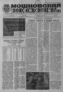 Пролетарии всех стран, соединяйтесь! ОРГАН МОШКОВСКОГО РАЙОННОГО КОМИТЕТА КПСС и р а й о н н о го с о в е т а н а р о д н ы х д е п у т а т о в н о в о с и б и р с к о й о б л а с т и Газета основана 23 августа 1931 года j ЧЕТВЕРГ, Газета выходит по вторникам, Ц Е Н А № 123 (4933) 11 октября 1984 года. четвергам, субботам. 2 К О П. ДНЕВНИК ПОЛЕВЫХ РАБОТ СООБЩАЕТ ПРЕСС-ГРУППА ПРИ РАЙКОМЕ КПСС ЗА ОТЛИЧНОЕ КАЧЕСТВО РАБОТЫ и ВЫСОКОПРОИЗВОДИТЕЛЬНЫЙ ТРУД ПОДНЯТ В ЧЕСТЬ: КИРПИКОВА Дмитрия Николаевича, тракториста совхоза «То- мил обский» , занятого вспашкой зяби и выполняющего сменную норму выработки на 170 и более процентов. СВЕДЕНИЯ о ходе полевых работ на 10 октября 1 графа — хозяйство, 2 — засыпана се ш н Л . (г), 3 — в процентах к плану, 4 — поднято зяби (га), 5 — в процентах к плану. 6 — убрано соломы (га), 7 — в процентах к плановой площади «Барлакский» 636 100 2941 82- 1374 68 «Белоярский» 92 100 470 76 450 90 «Зеркальный» 240 100 850 65 500 71 «Сокурский» 660 100 1450 54 1000 40 «Большевик» 535 100 820 36 842 42 «Ленинец» 700 93 2350 67 2000 71 «Смоленский» 515 89 2254 70 1025 48 «Восход» 1300 89 1809 31 1644 27 «Мошковский» 1750 85 2550 34 1883 24 «Ояшинский» 906 80 1846 49 1343 32 «Томиловский» 780 76 2039 53 1385 40 «Галинский» 708 71 1297 32 985 25 «Союз строителей» 333 47 1248 38 565 21 «Сосновский» 406 39 1221 31 547 13 По району: 9461 79 23085 47 15543 34 Мокрый снег и дождь не позволили 8—9 октября активно вести скирдование соломы. За эти два дня она в районе убрана с 455 гектаров. Занимались этой работой в совхозах «Восход», «Сое и о в с к и й», «Большевик», «Томиловский», «Барлакский» и «Смоленский». Ниже, чем в предыдущие дни, были и темпы вспашки зяби. За 8—9 октября она поднята на 1470 гектарах. Быстрее других вели вспашку механизаторы совхоза «Барлакский», где ежедневная прибавка составила в среднем 122 гектара. Неплохо потрудились 8—9 октября трактористы сов. хозов «Восход», «Томиловский». Ниже своих возможностей поработали механизаторы совхозов «Ояшинский», «Боль, шевик», «Сокурский», колхоза «Ленинец». Очень незначительная прибавка на подъеме зяби в «Мошковском», «Соснов- ском», «Союзе строителей». Активная работа ведется на токах. В хозяйствах засыпают и подрабатывают на семена все зерно, пригодное для этой цели. Погодные условия не позволяют делать выбор зерна на семена как по культурам, так и по их сортам. Часть семенных участков пшеницы еще не убрана. Трудно сказать, удастся ли получить с них хорошие семена. Поэтому правильно поступают там, где засыпают максимальное количество овса. Весь овес, из которого можно получить качественные семена, следует оставить в хозяйствах и провести соответствующую его подработку. С планом засыпки семян справились в совхозах «Барлакский», «Сокурский», «Боль, шевик», «Белоярский», «Зеркальный». Они оказывают посильную помощь другим хозяйствам района в этом важном деле. Надо сделать все для того, чтобы выполнить план засыпки семян в каждом колхозе и совхозе. Главной задачей земледельцев остается быстрейшее завершение уборки хлебов. С учетом конкретной обстановки необходимо использовать любую возможность для работы комбайнов, применять повторный обмолот, трудиться в любое время суток, особенно при отрицательных температурах воздуха и отсутствии осадков в виде дождя и мокрого снега. СЕГОДНЯ НЕЛЬЗЯ РАССЛАБЛЯТЬСЯ НИ НА МИНУТУ. ОТ САМООТВЕРЖЕННОГО ТРУДА ХЛЕБОРОБОВ ЗАВИСИТ СУДЬБА УРОЖАЯ. СЛОВО ХЛЕБОРОБА - К ХЛЕБОРОБАМ СУДЬБА УРОЖАЯ В НАШИХ РУКАХ! На третьей ферме совхоз