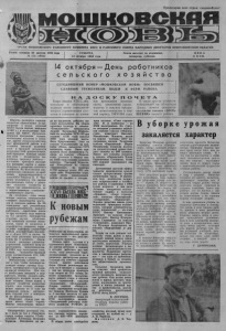 Пролетарии всех стран, соединяйтесь! ОРГАН МОШКОВСКОГО РАЙОННОГО КОМИТЕТА КПСС и р а й о н н о г о с о в е т а н а р о д н ы х д е п у т а т о в н о в о с и б и р с к о й о б л а с т и Газета основана 23 августа 1931 года - СУББОТА, Газета выходит по вторникам, Ц Е Н А № 124 (4934) 13 октября 1984 года. четвергам, субботам. 2 КОП. 14 ок тября — День р а б о т н и к о в с е л ь с к о г о х о з я й с т в а с е г о д н я ш н и й н о м е р «мошкорской НОВИ» ПОСВЯЩЕН СЛАВНЫМ ТРУЖЕНИКАМ ПОЛЕЙ И ФЕРМ РАЙОНА. Н А Д О С К У П О Ч Е Т А Бюро обкома КПСС, облисполком и облсовпроф подвели итоги социалистического соревнования колхозов и совхозов за успешное проведение зимовки скота, увеличение производства и закупок продуктов животноводства в зимний период 1983/1984 года. В числе других хозяиств- победителей на областную Доску почета заносится коллектив совхоза «БОЛЬШЕВИК» нашего района. Широко развернув социалистическое соревнование за претворение в жизнь решений XXVI съезда партии, майского (1982 г.) и последующих Пленумов ЦК КПСС, Продовольственной программы страны коллективы колхозов и совхозов, других сельскохозяйственных предприятий района в обстановке высокой политической и трудовой активности встречают свой профессиональный праздник. Каждый труженик села — механизатор, животновод, зверовод, рыбовод— постоянно чувствует неослабное внимание партии и правительства к развитию сельского хозяйства. На Всесоюзном экономическом совещании по проблемам агропромышленн о г о комплекса товарищ К. У. Черненко подчеркнул, что партия рассматривает заботу о развитии сельского хозяйства не только как экономическую, но и первостепенную социально- политическую задачу. За последние годы значительно окрепло сельскохозяйственное производство колхозов и совхозов района. До 33 лошадиных сил увеличилась энерговооруженность каждого работника, заработная плата за три последних года выросла на 3,5 процента. Завершается освоение научно - обоснованной зональной системы земледелия, свыше 11 процентов в севооборотах занимают лары, за счет коренного улучшения земель дополнительно вовлечено в оборот 670 га пашни. За три года увеличено ‘поголовье коров на 3 процента. Значительное внимание уделяется укреплению кормовой базы общественного животноводства. В 1984 году заготовлено сена, сенажа, витаминно-травяной муки соответственно 118, 166, 111 процентов к плану. Земледельцы заботятся сейчас о том, чтобы заложить надежную основу урожая будущего, завершающего года одиннадцатой пятилетки. Для этого необходимо засыпать и подработать семена, поднять зябь, развернуть полным ходом ремонт техники. Очень важно в каждом хозяйстве полностью убрать всю солому, своевременно вывезти ее и сено на фуражные склады, организовать строгий учет и контроль за их расходованием. Уборочная страда уже назвала имена своих героев. Многие земледельцы, несмотря на трудности, добились высоких результатов. На уборке силосных культур в совхозе «Томиловский» кукурузовод Андрей Васильевич Шифель- байн на комбайне КСК-100 при задании 4100 тонн накосил 5600 тонн зеленой массы. Яков Христианович Септ из совхоза «Смоленский» на ком. байне «Нива» намолотил 7175 центнеров зерна. Звено коммуниста Ильи Алексеевича Гуляева из совхоза «Мошков- ский» уложило в скирды свыше 1000 тонн соломы хорошего качества. Григорий Кириллович Кондратьев из совхоза «Барлакс