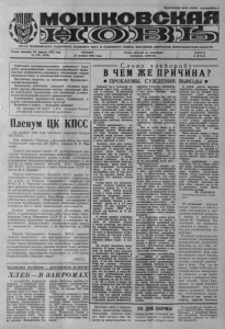 Пролетарий всех стран, соединяйтесь! ОРГАН МОШКОВСКОГО РАЙОННОГО КОМИТЕТА КПСС и р а й о н н о г о с о в е т а н а р о д н ы х д е п у т а т о в н о в о с и б и р с к о й о б л а с т и Газета основана 23 августа 1931 года ЧЕТВЕРГ, Газета выходит по вторникам, 1 Ц Е Н А № 129 (4939) 25 октября 1984 года. четвергам, субботам. 2 К ОП . / Работники агропромышленного комплекса! Уско- ! ряйте интенсификацию сельскохозяйственного производства! Добивайтесь надежного обеспечения страны продовольствием и сельскохозяйственным сырьем! Настойчиво боритесь за выполнение Продовольственной программы! I Колхозники, работники совхозов! Активнее внедряйте научно обоснованную систему земледелия! Шире используйте мелиорацию для повышения устойчивости сельскохозяйственного производства! Увеличивайте производство зерна, технических и других сельскохозяйственных культур! Внимание и заботу — будущему урожаю! (Из Призывов ЦК КПСС к 67-й годовщине Великой I Октябрьской социалистической революции). Пленум ЦК КПСС 23 октября 1984 года состоялся очередной Пленум ЦК КПСС. При открытии Пленума с большой речью выступил Генеральный секретарь ЦК КПСС товарищ К. У. Черненко. Пленум рассмотрел вопрос «О долговременной программе мелиорации, повышении эффективности использования мелиорированных земель в целях устойчивого наращивания продовольственного форда страны». С докладом -по этому вопросу выступил член Политбюро ЦК КПСС, Председатель Совета Министров СССР товарищ Н. А. Тихонов. Пленум. Центрального Комитета КПСС принял постановление, в котором полностью одобрил содержащиеся в речи на Пленуме Генерального секретаря ЦК КПСС К. У. Черненко положения и выводы о дальнейшем развитии экономики страны, основных направлениях интенсификации сельскохозяйственного производства, •повышении роли мелиорации в устойчивом наращиваний продовольственного фонда. Партийным, советским и хозяйственным органам, общественным организациям и трудовым коллективам необходимо постоянно руководствоваться ими в своей практической деятельности. Пленум одобрил утвержденную Политбюро ЦК КПСС и изложенную в докладе члена Политбюро, Председателя Совета Министров СССР Н. А. Тихонова долговременную программу мелиорации и повышения эффективности использования мелиорированных земель на двенадцатую пятилетку и на перспективу до 2000 года. Пленум Центрального Комитета КПСС выразил твердую уверенность, что долговременная программа развития мелиорации земель будет воспринята коммунистами, всеми трудящимися как важнейшая хозяйственно-политическая задача, решение которой будет активно способствовать устойчивому развитию аграрного сектора экономики, дальнейшему .повышению на этой основе благосостояния советских людей. (ТАСС). ВЕЛИКОМУ ОКТЯБРЮ - ДОСТОЙНУЮ ВСТРЕЧУ! Х Л Е Б —В З А К Р О М А Х С л о в о х л е б о р о б у В ЧЕМ ЖЕ ПРИЧИНА? • ПРОБЛЕМЫ, СУЖДЕНИЯ, С достоинством выдержали поединок с капризной сибирской осенью хлеборобы совхоза «Томиловский». Убран трудный хлеб. И в этом большая заслуга многих механизаторов, в том числе комбайнеров — Леонида Ивановича За- рочинцева, намолотившего более семи тысяч центнеров зерна, Александра Иосифовича Балле, выдавшего из бункера своего комбайна более 5,5 тысячи центнеров хлеба. Хорошие показатели у членов звена Алексея Михайловича Серикова. Выполнил сезонное зада