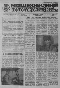 Пролетарий всех стран, соединяйтесь! ОРГАН МОШКОВСКОГО РАЙОННОГО КОМИТЕТА КПСС и районного совета народных депутатов новосибирской ОБЛАСТИ Газета основана 23 августа 1931 года 1 • СУББОТА, Газета выходит по вторникам, ■ 1 . Ц Е НА • № 130 (4940) 27 октября 1984 года. четвергам, субботам. 2 КО П. I Да здравствует Ленинский комсомол — боевой по- I мощник и надежный резерв Коммунистической пар- I тии, передовой отряд молодых строителей комму- [! ! низма! Юноши и девушки! Неустанно овладевайте знаниями, культурой, профессиональным мастерством! Приумножайте революционные, боевые и трудовые традиции Коммунистической партии и советского народа! Учитесь по-ленински жить, работать, бороться! Славные ветераны, наставники молодежи! Передавайте молодому поколению свои знания, богатый жизненный опыт! Воспитывайте юношей и девушек пламенными патриотами нашей Родины, самоотверженными борцами j за дело Ленина, за коммунизм! I (Из Призывов ЦК КПСС к 67-й годовщине Великой ) Октябрьской социалистической революции). ВЕЛИКОМУ ОКТЯБРЮ - ДОСТОЙНУЮ ВСТРЕЧУ! ПО ИТОГАМ РАБОТЫ Коллектив Мошкове к о г о энергоучастка Бердских электросетей девятимесячный план реализации электроэнергии выполнил на 102 процента. Потери электроэнергии составили 3 процента вместо 7,8 процента по плану. За летний период произведена реконструкция сетей с переводом на четырехпроводные улиц Механизаторской, Первомайской, Калинина. Улучшено энергоснабжение улицы Октябрьской. Произведены замена подстанции на улице Калинина, светильников — на улицах Восточная,. Набережная, Мичурина. Коллектив участка досрочно подготовил устройства подстанций и сетей к эксплуатации в зимних условиях. Дополнительно введено 50 квадратных метров производственной площади. По итогам работы и выполнению обязательств коллективу за 1, 2 и 3 кварталы присуждено 1-е классное место среди подразделений энергопредприятия с вручением переходящего Красного знамени и денежной премии. В районных и областных соревнованиях на профессиональное мастерство бригада участка заняла 1 и 2 место. Заслуженным авторитетом пользуются электромонтеры Владимир Александрович Светкин, Аркадий Александрович Ломаев, щофер Михаил Ефимович Романчук и другие. С ОПЕРЕЖЕНИЕМ ГРАФИКА Ежегодно автомобили с т ы Мошковского автотранспортного предприятия «Транссельхозтехника» в самые страдные дни весенних, летних и осенних полевых работ оказывают большую помощь труженикам сельского хозяйства. В этом сезоне водителями предприятия было перевезено сельскохозяйственной продукции на 118,3 процента к доведенному плану. Задание девяти месяцев по перевозке грузов выполнено на 101 процент, валовый доход составил 105,3 процента. Успех дела определяют люди, а их на предприятии трудится немало. Многие водители работают с опережением графика. Уже в счет 1985 года работают Михацл Михайлович Семенов, Александр Федорович Коваленко, Владимир Федорович Луференко, Иван Васильевич Ковальчук, Отто Андреевич Ленк, Александр Александрович Анисимов, Иван Федорович Фоль, Виктор Готли- бович Рауш и Виктор Владимирович Митюков. В канун Великого Октября и своего профессионального праздника — Дня работников автомобильного транспорта — этот коллектив выполнил план десяти месяцев. З А В Т Р А - Д Е Н Ь РАБОТНИКОВ АВТОМОБИЛЬНОГО Т РАНСПОР Т А 16 октября в диспетчерской автога