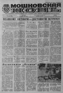 Пролетарии всех стран, соединяйтесь! ОРГАН МОШКОВСКОГО РАЙОННОГО КОМИТЕТА КПСС и районного совета н а ро дны х депутатов новосибирской области Газета основана 23 августа 1931 года № 134 (4944) ВТОРНИК, 6 ноября 1984 года. Газета выходит по вторникам, Ц Е НА четвергам, субботам 2 КОП. ВЕЛИКОМУ ОКТЯБРЮ- ^ О 1 Р Л Л ’ 1* ' -ДОСТОЙНУЮ ВСТРЕЧУ! Коммунисты! Будьте в авангарде всенародной борьбы за выполнение исторических решений XXVJ съезда \ партии, последующих Пленумов ЦК КПСС! Всестороннее совершенствование общества развито-] го социализма — стратегическая задача партии и ( народа! (Из Призывов ЦК КПСС к 67-й годовщине Великой Октябрьской социалистической революции). В с ч е т будущего года Среди работников районного управления бытового обслуживания населения предоктябрьское соревнование возглавили коллективы комплексно - приемных пунктов сел Радуги и Емельяновки, где заведующими Ольга Васильевна Кудряшова и Наталья Павловна Бор-' зенкова. Здесь с девятимесячным заданием справились на 140 процентов: Почти два плана за этот период выполнили работники парикмахерской, полтора — приемного пункта по ремонту бытовой техники. В счет 1985 года работают швеи Валентина Михайловна Сарычева, Лидия Николаевна Семенова, парикмахеры Галина Николаевна Зябликова, Галина Николаевна Щукина, Валентина Михайловна Пономарева. Добросовестно относятся к своим обязанностям приемщики Раиса Петровна Миронова и Любовь Михайловна Петрова. С 5 ноября театрализованным представлением в Мош- ковском кинотеатре открылась неделя детского кино. Подготовили праздник работники районного Дома культуУспешно выполняют доведенные планы работники головного маслозавода. За 10 месяцев товаров народного потребления произведено на 498 тысяч рублей, что на 44 тысячи превышает задание. Объем реализации за этот период выполнен на 104,4 процента, производительность труда возросЗа десять месяцев текущего года районное производственное объединение «Сельхозхи- мия» выполнило объем работ в условных гектарах на 121 процент, грузоперевозок — на 128 процентов, грузооборот составил 107 процентов к заданию. План внесения минеральных удобрений на поля хозяйств ряйонт. под урожай Праздник Великого Октября коллектив районного объединения «Сельхозтехника» встречает хорошими показателями в труде. Успешно справляются с доведенными планами многие производственные подразделения предприятия, в том числе — ремонтная мастерры. Закончилось представление демонстрацией сказки «Золотые рога». В течение этой недели ребята увидят фильмы: «Вечера на П о м о щ ь с е л ь ч а н а м Коллектив «Райсельхозэнер- го» с начала года общий объем работ выполнил на 107 процентов к доведенному плану, в том числе капитальный Дела маслоделов ла на 8,5 процента к плану, себестоимость продукции снижена на 3 процента. Постоянно перевыполняют сменные задания члены бригады Марии Константиновны Ковалевой из Ояшинского масло1985 года выполнен на 160, органических — на 100 процентов. На 900 гектарах проведено комплексное окультуривание полей. Добросовестно трудятся на вывозке удобрений трактористы Валерий Александрович Пример в труде ская станции обслуживания животноводческих ферм, автомобилей. Первое место в предпраздничном соревновании занял цех по ремонту гидрораспределителей, где бригадиром Алекхуторе близ Диканьки», музыкальны