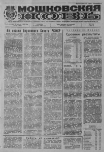 Пролетарии всех стран, соединяйтесь! ОРГАН МОШКОВСКОГО РАЙОННОГО КОМИТЕТА КПСС и районного совета народных депутатов новосибирской области Газета основана 23 августа 1931 года СУББОТА, Газета выходит по вторникам, Ц Е НА № 147 (4957) 8 декабря 1984 года. четвергам, субботам 2 КОП. На сессии Верховного Совета РСФСР Москва. (ТАСС). 5 декабря в Большом Кремлевском дворце открылась десятая сессия Верховного Совета РСФСР десятого созыва. Бурными, продолжительными аплодисментами встретили депутаты товарищей К. У. Черненко, Г. А. Алиева, В. И. Воротникова, М. С. Горбачева, В. В. Гришина, А. А. Громыко, Г. В. Романова, М. С. Со- ломенцева, Н. А. Тихонова, П. Н. Демичева, В. И. Долгих, В. В. Кузнецова, В. М. Чебри- кова, М. В. Зимянина, И. В. Капитонова, К. В. Русакова, Н. И. Рыжкова. Была утверждена повестка дня сессии. В нее включены вопросы о Государственном плане экономического и социального развития РСФСР на 1985 год и о ходе выполнения, плана в 1984 году, о Государственном бюджете республики на 1985 год и об исполнении <бюджета за 1983 год, об утверждении Указов Президиума Верховного Совета республики. С докладом о Государственном плане экономического и социального развития РСФСР на 1985 год и выполнении плана в 1984 году выступил заместитель Председателя Совета Министров РСФСР, председатель Госплана РСФСР депу- • тат Н. И. Масленников. Он отметил, что план на 1985 год основывается на решениях XXVI съезда партии, последующих Пленумов ЦК КПСС. В плане учитывались наказы избирателей, итоги выполнения заданий пятилетки за 1981—1983 годы и результаты работы за 1984 год. Остановившись на ходе выполнения' заданий текущего года, докладчик сообщил, что производительность труда в промышленности республики повысится в этом году на 4 процента при плане 3 процента, себестоимость дополнительно к плану снизится на 0,5 процента. Национальный доход республики возрастет по сравнению с 1983 годом на 3,2 процента. Объем промышленного производства увеличится на 3,8 процента при плановом приросте 3,5 процента. Настойчиво работают над реализацией Продовольственной программы „труженики сельского хозяйства. Несмотря • на неблагоприятные погодные условия в текущем году, объем валовой продукции сельского хозяйства будет на 3,8 миллиарда рублей больше, чем в среднем за годы десятой пятилетки. В докладе отмечалось, что в проекте плана завершающего года одиннадцатой пятилетки темпы роста по большинству важнейших показателей намечены более высокими по сравнению с предыдущим периодом. Национальный доход республики планируется увеличить на 4 процента, объем промышленного производства должен возрасти на 3,8 процента. Объем валовой продукции сельского хозяйства планируется довести до 65,8 миллиарда рублей с ростом против среднегодового уровня десятой пятилетки на 15 процентов. Особое внимание обращено на увеличение производства зерна, задание по которому установлено на уровне пятилетнего плана. Предусматривается рост реальных доходов на душу населения на 3,6 процента. Среднемесячная заработная плата рабочих и служащих должна повыситься до 200 рублей. Выплаты и льготы из общественных фондов потребления увеличатся на 4,1 процента. На территории РСФСР предстоит построить и ввести в эксплуатацию более 62 миллионов квадратных метров общей площади жилых домов. Говоря о дальнейшем росте экономики автономных республик, к