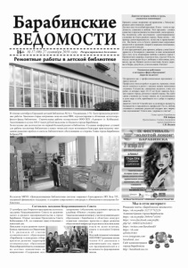 Барабинские ВЕДОМОСТИ 1 6 + № 17 (98) 27 сентября 2019 года Распространяется бесплатно Дорогие ветераны войны и труда, уважаемые пенсионеры! Примите самые искренние поздравления с Междуна родным днем пожилых людей! Для всех нас это особый праздник. В нем - тепло и сер дечность, уважение и любовь. Этот праздник - символ единства и преемственности поколений, связи времен. Вы посвятили себя неустанному самоотверженному служению во благо родного города. Ваша жизнь - это пример самоотверженности, мужества и нравственно сти. Вы были, есть и будете хранителями моральных ценностей и традиций, опорой и верными помощника ми для детей и внуков. В этот праздничный день примите добрые слова благо дарности и безмерного уважения за ваш неоценимый труд, силу духа, искреннюю любовь к нашему городу! Крепкого вам здоровья, благополучия, счастья! И пусть всегда с вами рядом будут любящие и заботливые дети, внуки, друзья. Живите долго и счастливо, будьте здоро вы и бодры, радуйтесь успехам ваших близких! Уважаемые работники и ветераны сферы образования! Дорогие педагоги! Поздравляем вас с профессиональным праздником — Днём учителя! Профессия учителя требует мудрости, терпения, готов ности меняться и расти с каждым новым поколением учеников. Сегодня вы, уважаемые педагоги, учите тех ребят, от которых через 10-15 лет будет зависеть буду щее нашего города, региона и нашей страны. Вы даёте своим ученикам не только знания, но и воспитываете в детях веру в себя, приобщаете их к добру и справед ливости. Дорогие учителя! Спасибо вам за душевную щедрость, бескорыстие и преданность профессии! Пусть любовь учеников и уважение родителей подарят вам творче ское вдохновение! Успеха вам, здоровья и счастья! Глава города Барабинска Р.В. Бобров Председатель Совета депутатов города Барабинска С.В. Иванов - ч IX ФЕСТИВАЛЬ "ЗОЛОТОЙ ЛОКОН" БАРАБИНСКА Ремонтные работы в детской библиотеке В течение сентября в Городской детской библиотеке №2 (ул. Ульяновская, 151) были проведены ремонт ные работы. Заменены старые витринные окна на окна ПВХ, отремонтирован и облицован металлопро- филем фасад библиотеки. Строительные работы осуществляло ООО ПСК «Адамант» (г. Куйбышев). Ассигнования в сумме 660,0 тысяч рублей выделены из бюджета города Барабинска. За последние два десятилетия это первый большой ремонт в библиотеке. Создание комфортных условий для работы коллектива библиотеки и юных читателей стало возможным благодаря пристальному вни манию решению проблем в системе библиотечного обслуживания со стороны Главы города Барабинска Боброва Р.В. иидо ЦВЛТСЛЫТРЫИДОСУГА р.ьлше№ш,5 ГРАН-ПРИ 2 0 0 0 0 р у б л ей Коллектив МКУК «Централизованная библиотечная система» выражает благодарность ИП Лоза Т.П., оказавшей финансовую поддержку в создании современного интерьера в обновленном помещении би блиотеки. Состоялось заседание Координационного Совета 25 сентября в зале Открытого пространства состоялось заседание Координационного Совета по развитию малого и среднего предпринимательства в городе Барабинске. Открыл заседание Председатель Совета Кибальников А.В., он ознакомил присутствующих с повесткой дня. Начальник отдела развития малого бизнеса, торговлииуслугИвасюткина Е.А . р а с с к а з а л а об у ч а с т и и муниципального образования г.Барабинска в конкурсном отборе проектов развития территори