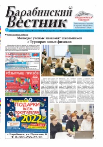 Их именами названы улицы Барабинцы присоединились к региональной акции «Их именами названы улицы». В преддверии Дня Героев Отечества волонтёры раздали прохожим солдатские конверты и рассказали о подвигах героев, именами которых названы улицы в Барабинске: Апарина, И. Воронкова, Пере- возникова, Папшева, О. Сачевского. Дарить людям добро В Центре дополнительного образования детей состоялась классная встреча с Ириной Колесник, посвященная празднованию Дня волонтера. Ирина является исполнительным директором благотворительного фонда помощи тяжелобольным детям «Сибирь. Боли-нет!». Гостья рассказала ребятам, как начинала свой путь, как тоже когда-то была волонтёром, и для неё это ни в коем случае не профессия, а призвание. Дети задавали вопросы и с удовольствием слушали ответы. В завершении Ирина пожелала всем здоровья, дарить добро людям несмотря ни на что, не ожидая взамен никаких вознаграждений и резюмировала: «Самое главное для волонтера - это бескорыстие и большое сердце». Патриотическое воспитание День Героев Отечества Прикоснись ко мне добротой» « В рамках проведения Декады инвалидов в Барабинском отделении Всероссийского общества слепых совместно с Центральной библиотекой было проведено мероприятие «Прикоснись ко мне добротой!». Присутствующим рассказали о доброте и милосердии, об отношении нашего общества к людям с ограниченными возможностями. Вспомнили выражения, поговорки и пословицы о доброте, участвовали в викторине «Здоровье дороже золота», а также написали свои заветные желания. «Перерыв на кино» Шучащихся школы №47 участвовали во всероссийском телепоказе документальных фильмов о фронтовиках, организованных Фондом «Мост поколений». Юноши и девушки просмотрели документальные ленты: «Победа», «Ржев», «Слепов Владимир Яковлевич», «Берчиков Владимир Алексеевич». Ценность этих лент в том, что они рассказывают не какую-то вымышленную историю, а предлагают зрителю реальные факты. Уникальные фотографии, кадры военной хроники, интервью с ветеранами - все это можно найти в документальных фильмах о войне, что позволило нашим учащимся еще раз почтить память всех тех, кто проливал кровь во имя нашего светлого будущего. «И невозможное возможно» В клубе «Берегиня» работник читального зала Центральной библиотеки провела вечер-посвящение «И невозможное возможно» для людей с ОВЗ. 3 декабря отмечен в календарях всего мира, но не как праздник, а, скорее, как напоминание о том, что среди нас живут особенные, не такие как все, люди. Напоминание о том, что мы должны быть терпимее, внимательнее к людям, которые не похожи на нас, и которые с ограниченными возможностями могут и умеют радоваться жизни. В ходе мероприятия гости отгадывали загадки и викторины, называли песни из кинофильмов, делились мечтами, а в конце написали пожелания друг другу на цветке добра. О созыве тринадцатой сессии Совета депутатов Барабинского района Новосибирской области Распоряжение председателя Совета депутатов Барабинского района Новосибирской области четвертого созыва от 09 декабря 2021 г. № 8 Созвать тринадцатую сессию Совета депутатов Барабинского района Новосибирской области 24 декабря 2021 года, в 14-00 ч. Место проведения: город Барабинск, ул. Островского, 8 (здание администрации Барабинского района - большой зал). Предложить на рассмотрение Сов