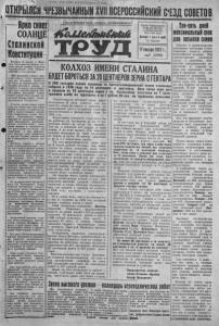 рав/!, n -д газет и издательств (1 зкз) ЧРЕЗВЫЧАЙНЫЙXVII ВСЕРОССИЙСКИЙС‘ЕЗД советов Столниской Конституции- Вечером 15 января в Боль шом Кремлевском дворце сто лицы няшей родины открылся Чрезвычайный XVII Всерос сийский С’ечд Советов. 1200 делегатов С’езда и мно гочисленные гости, заполняю щие зал заседания, принесли на С'езд не только лично свои лучшие чувства и мыс^и, но чувства и мысли представляе мых ими народов первой сре ди равных республик Совет ского Союза—Российской Со ветской Федеративной Социа листической Республики. И когда волны эфира разно сили по необ'ятным просторам нашей родины гул рукоплеска ний и приветственных возгла сов, сотрясавших своды Боль т о ю Кремлевского дворца, каждый из трудящихся, имею щий возможность воспольэо ваться услугами родио, прек расно понимал и представлял, что происходят на с’ечде, чье появление и имя вызывает этот восторг, кому приносятся в дар эти бурные чувства люб ви и преданности нашето на рода . Впиваясь взором в черный диск радиорепродуктора, сот ни трудящихся нашего района, как и миллионы других тружени ков советской земли, мысленно переносились туда, в Кремль, где заседает С’езд и при соединяли к своим избрании кам-деЛе/'ЙЙЦ” ~с'езда свою горячую любовь, свою беспре дельную преданность партии, правительству и великому ор ганизатору социалистических лобед-вождю и учителю трудя щихся товарищу СТАЛИНУ. Ог исторического Чрезвычай ного VIII Всесоюзного С’езда Советов протянулись крепкие связующие инти к Чрезвычайно му XVII Всероссийскому С езду Советов. Ярко сияет солнце Сталинской Конституции СССР в лучах которой рождается, по образному выражению Михаи л а Ивановича Калинина, ее родная дочь--Конституцич Российской Советской Феде- Р ативной Социалистической еспублики. Встреченный взрывом горя чих долго длившихся привет ствий, товарищ Калинин об разно и ярко сделал свой за мечательный доклад о проекте новой Конституции РСФСР. Его речь, богато насыщенная яркими примерами и сравнения ми прошлой, дореволюцион ной и настоящей жизни, часто вызывала бурю аплодисментов, а последние ее слова потону ли в громовых овациях. Этим самым участники С'ез да выражали гордое сознание нашего советского народа, что с мраком прошлого локон чено навсегда. Они прославляли путь,ярко озаренный лучами Сталинской Конституции, путь зажиточной культурной, свободной и радо сгной жизни, на который вы вела нас коммунистическая партия и верный соратник и продолжатель дела Ленина-ве- лккиА любимый вождь и учи тель товарищ Сталин. Они выражали радостное сознание того, что этот путь, утрамбованный боями за соци ализм, прочно вошедший в нашу жизнь, как полновласт ный хозяин,—верно ведет нас к сияющим высотам коммуниз ма—высшему идеалу человече ского счастья. ^ Пролетарии всех стран, соединяйтесь! Т Р У Д Орган Карасукского Райкома ВКЛ(б) и Райисполкома Зап.-Сиб. края Выходит 1 раз в5 дней Ст. Кзрэсук 17январ19я37г. МзЗ ( 480 ) КОЛХОЗ ИМЕНИ СТАЛИНА БУДЕТБОРОТЬСЯЗА20ЦЕНТНЕРОВЗЕРНАСГЕКТАРА в среднем по 15 центнеров зерна с га. Колхозники получили по 7 кило граммов хлеба на трудодень н но 1 рублю 25 коп. на ? p S ! b деньгам!: Зажиточность обгоняет наши пред положения, И надо сказать, что мы многого недоучитывали и многого не дооценивали ,когда составляли свой про изиодстяенный и финансовый план на 1936 год. Колхозники говорили: «получить б