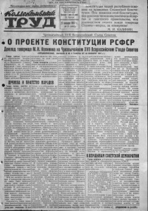/ / т ' L '4 . S и О разл. п-д газет и издательств (1 экз) Пролетарии всех стран, соединяйтесь! т р у Я Орган Карасук-ского Райкома ВКП(б) и Райисполкома Зап.-Сиб. края Выходкт 1 раз в5 дней Ст. Карэсук 27января1937г, № 5 ( 482 ) лонстйтуция нашей республики осно вана на принципах Сталинской Консти туции. Под знаменем этой Конституции, под руководством коммунистической пар тии и советского правительства, под руководством нашего вождя товарища Сталина—вперед, за коммунизм! М. И. КАЛИНИН. Чрезвычайный XVII Всероссийский Съезд Советов •О ПРОЕКТЕ КОНСТИТУЦИИ РСФСР ДокладтоаврищаМ.И, КалининаиаЧрезвычайномXVI ВсероссийскойСеда Советов (ПРОДОЛЖЕНИЕ. НАЧАЛО В № 4 ГАЗЕТЫ ОТ 22 ЯНВАРЯ 1937 г.). Глава третья трактует] j об образовании высших органов власти республи ки — Верховного Совета, избираемого на 4 года. Верховный Совет является носителем высшей респуб ликанской власти и осуще ствляет все права,согласно статей 13 и 19 настоящей Конституции. Верховный Совет избирает Президиум, который является ему под отчетным, во всей своей деятельности. Глава четвертая устанав ливает высший исполнитель ный и распорядительный орган государственного управления РСФСР—Совет Народных Комиссаров, оп ределяет его компетенцию ифункции народных комис сариатов. ДРУЖБА И БРАТСТВО НАРОДОВ W Глава пятая, шестая и седьмая говорит о высших органах государственной власти в автономных рес публиках и автономных областях. Национальный вопрос в нашей республике имеет огромное значение. Он и в дореволюционной России не мог не иметь значения, но царское правительство относительно больше счи ^ талось с такими культурны ми национальностями, как Польша, Финляндия, Латвия, Эстония. В отношении этих национальностей самодер жавие проводило более тонкую политику, так как оно наталкивалось на куль турную национальную бур жуазию, сопротивление которой носило более ор ганизовачный характер Всем известно, что, напри мер, часть польской бур жуазии ориентировалась на Россию, как на выгод ный рынок для сбыта своих товаров. Достаточно на помнить конкуренцию ноль ской мануфактуры с мос ковской, борьбу польских фабрикантов с московскими за влияние в правитель ственных сферах, близость остзейского дворянства , (баронов) ко двору царской династии. Одним словом, с этими национальностями, правильнее сказать, с гос подствующими их классами барское правительство счи талось больше, чем с дру гими национальностями. Что же касается восточ ных и кавказских народов, то здесь была политика —жми, дави, разделяй и властвуй, а главное—грабь и грабь. И действительно, вплоть до пролетарской революции происходил гра беж земель, принадлежа щих башкирским, татар ским, монгольским и тюрк ским крестьянам. Разумеется, такая поли- 1 тика разоряла крестьянство национальностей. Оно те ряло все надежды. В его глазах его собственная ра бота делалась бесцельной. Систематический грабеж земель, непосильные на логи, грубый произвол властей, постоянное униже ние —все это вело не к развитию, а к деградации хозяйства, а тем самым и к деградации целых наро дов, . , Для иллюстрации приведу выдержку из политобзора, составленного начальником жандармского управления по Уфимской губернии в 1902 году. „По составу своего на родонаселения, —говорится в этом обзоре,—с пре обладающим инородческим элементом, Уфимская губер ния может быть отн
