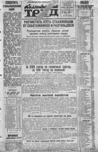 > -покончить сневыполнением ’ Г ' / ^Пролкыараи всех стран, соед норм I Работающий 8 колхозе имени Эйхе (ХорошеншяМТС) тракторный отряд №1(бригадир РЯДНО) имеет среднюю выработку на трактор 71.5 г*. Иными словами на одну лошадиннуюсилу среднедневная вы работкасоставляет 20-25 сотых га. Чтобы нв убить окончательно поставившего себяупозорного столба бригадира тракторного отряда, председатель колхоза ЛУНАШЕВ держит на этом же уровнвеыра ботку живым тяглом. Происходит явное издевательство над тем могучим вооружением, котороеимеют наши колхозы для успешного вы полнения плансеве. Эти люди потеряли всякопеоня тие о долге, чести и наконец о государственной дисциплине. Для них план н его составные части— ороки, нормы выработки, качество работы— стали как бы пустым звуком. Что это LMK не прямой кулацкий саботаж государственного плана весеннего сеав, задачи борь бы за высокийурожай? 1 И вот результат: план еева оо району на 20мая выпноелнтолько на 66,3 процента. Прирост за истекшую пятидневку составил лишь 20.5процента Саботажники толкают раойн на то, чтобы он затянул севдо июян. Разумеется, не Лукашев и Рядно вдвоем’ делают згу кулацкую непогодь, но они являют собйо тип тех людей, на которых надо со всейсилойобрушиться.! колхоз никам и органам пролетарской диктатуры. Кто сегодня не поймет, что нельзя дальше безобразничать, кто позволит себе пренебрегать борбьу за номрывыработки, за немедлен- ; куюперестройку работы атом духе, как это уже неоднократно было указано арешениях партийных и со j Л* ' Орган Кярасукского Райкома ВКЛ(б) и Райисполкома Зап.-Сиб". края Г Выходит 1разв5 дней Ст. Карасук 22 мая 1937 г. СУББОТА № 29 ( 506 ) СВОДКА О ХОДГ ЯРОВОГО СЕВА ПО НОЛХО* ЗАМ КАРАСУИСКОГО РАЙОНА НА 20-е МАЯ 1937ГОДА. Q. О К шж РАСЧИСТИ)b ПУТЬ СТАХАНОВЦАМ ОТСАБОТАЖНИКОВИРАЗГИЛЬДЯЕВ! Руководители колхоза „Красная звезда" срывают работу тракторного отряда (Письмо бригадира стахановского тракторного отряда тов. ДУРИЦЫНА) Председатель колхоза , Крас ная звезда' ГИЧКОЛЕНКО и бригадир полевой бригады ПО- НАРИН считают, что законы и постановления пишутся для дураков, а не д ля таких .ум- ников“ как они. Поэтому Гич- коленко и Понарин не только сами не ведут борьбы за то, чтобы сеялки работала 18-20 часов в сутки, но и срывают работу тракторного отряда. Мы своевременно поставили вопрос о предоставлении нам одной добавочной конной сеял ки к трактору ЧТЗ, но эта сеялка была доставлена с большим опозданием и лишь после долгих поисков полево го бригадира Понарина. умы шленно уклонявшегося от вы полнения нашего требования и отсиживавшегося в поселке. По вине того же Понарина, как правило исчезающего из тракторного отряда в самые горячие моменты, был вызван 3 -х часовой простой тракто ра ЧТЗ так не было своевре менно подвезено семян а про изошла задержка с отводом участка для работы трак тора. Когда нам потребовалась вторая дополнительная кон ная сеялка к трактору ЧТЗ, получилась тоже история что и в первый раз. В довершение всего бывают такие случаи, что в трактор ный отряд по суткам не до ставляются продукты. Во всем этом мы усматри ваем кулацкие антисоветские действия, направленные к то му, чтобы сорвать нашу ра боту. ОТ РЕДАКЦИИ: Факты, о которых пишет тов. Дурицын, не случайны. В газета уже сообщалось, что а этом кол хозе чуть ли не из рук еф- ремовцев были вырваны от борные, лрояровизироеан