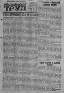i Пролетарии всех стран, соединяйте ТРУ РЬ 'ЙЛ . п - ! | 'Д г а з е т и и з л а т е г / ^ ^ у л “ и т г а а Северного пояюсв Райкома и Райисполкома Зап,-Сиб. края Выходнт 1 раз е 6 дне! Ст. Кара сук 3 0 ИЮНЯ 1 9 3 7 Г. СРЕДА № 36 ( 513 ) O ffliM ОРГАУЙЗОШЬ УХОД ЗА В0СЕВАИ1 На об'единенном заседа нии президиума крайис полкома и бюро крайкома партии, состоявшемся 16 июня, руководитель боль шевиков края тов. Р. И. Эйхе подверг суровой большевистской критике недостатки в борьбе за вы сокий урожай и развернул конкретную программу ра боты всех партийных и советских организаций на селе. Факты говорят о том, что партийные организа ции не сделали вывода из- указаний тов. Эйхе, не перестроили по-большеви стски свою работу. Вопросы организации борьбы за высокий урожай не находятся в центре внимания партийных и со ветских организаций. Нет достаточного внимания к такому важнейшему меро приятию, как прополка хлебов. До сознания кол хозников и колхозниц не доведено все хозяйственно политическое значение прополочных работ в этом году. Попрежнему неудов летворительно ведется пар тийно-политическая и пар тийно-организационная ра бота. Плохо поставлена агитация, раз'яснение важ нейших решений партии и правительства, важнейших очередных задач. Часто агитация ведется оторванно от конкретных политичес ких и хозяйственных задач, стоящих перед колхозами и совхозами. Районными руководите лями, директорами совхо зов и МТС о значении прополки написано немало директив, по этому поводу произнесено много хоро- шоих речей. Но они, однако, забывают, что далеко не достаточно ратовать за прополку, ее надо еще организовать. Нельзя от ветственное дело подме нять шумихой, всевозмож ными районными слетами и пустопорожними совеща ниями, надо итти в кол хозы, бригады и там орга низовывать колхозников на успешную прополку посевов, В ребрихинском районе, например, тоже много бол тали о необходимости про полки, но тем не менее в большинстве колхозов и до сих пор не созданы звенья по прополке, люди работают скопом, по 20-25 человек. Выработанные, трудодни распределяются поровну между всеми ра ботающими. Чтобы обес печить успех, надо прежде вседе ликвидировать обез личку и уравниловку. Прополка посевов—это большая трудоемкая работа. Надо, чтобы все трудоспо собное население колхозов приняло участие в этом важнейшем деле. Одиночки полольщики, как в колхозе „Коминтерн". Баевского района, где из 200 трудос пособных на прополке за нято только 6 человек, мно гого не сделают. Между тем такое, положение не в одном Баевском районе Прополка посевов решает и<усод борьбы за высокий урожай. Приведем всего лишь один факт, довольно убедительно иллюстрирую щий, к чему приводит ее недооценка. По скромным подсчетам колхоз „Безбож ник", Новосибирского райо на, в прошлом rofty из-за того, что не была организо вана прополка недособрал 1400 центнеров зерна. Это составляет ни много ни мало —5,1 килограмма на каж дый трудодень! Нельзя забывать также, что срыв прополки может поставить под угрозу ком- байноуборку. Когда ком байн работает на засорен ных посевах—чаще проис ходят поломкй и работает он плохо. Комбайн — главная уборочная машина. И ес ли мы не создадим ус ловий для безотказной работы комбайнов, если мы не очистим от сорняков поля, то мы можем сорвать темпы и сроки уборки урожая. А это приведет к большим потерям. Вни мание всех
