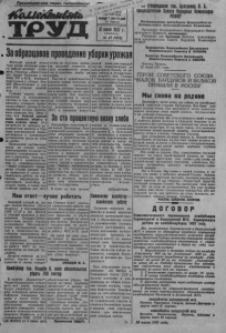 v \ Пролетарии всех стран, соединяйтесь! Т Р У Д n-п. ' -—кома gjgjv. " 1 -.ак.-Сиб. края ' Выщит 1 pas в6 дне! Ст. Карасук r- ° V V с~ »ч утверждении тов. Булганина Н. А. председателем СоветаНародных Комиссаров 31июля 1937 г. СУББОТА № 41 ( 518 ) РСФСР Постановление президиума Всероссийского центрального Исполнительного Комитета. Президиум Всероссийского Центрального Испол нительного Комитета постановляет: Утвердить тов. Булганина Николая Александро- вича председателем Совета Народных Комиссаров . Заобразцовоепроведениеуборкиурожая Богатый урожай этого года вряде колхозов наше го района начинает созре вать. Колхозы „Жол-Стали на", имени Тельмана и сов хозы 270 и 41-й, первыми приступили к уборке. Кол хоз «Жол-Сталина“ и сов хоз 270 убирают комбай ном. Главная задача сейчас колхозов и колхозников состоит в том, чтобы орга низовать успешное прове дение уборки урожая и без малейших потерь. Незабы- вать указания тов Эйхе о том, что богатый урожай ныне придется убирать в очень сжатые сроки. Это потребует от каждого ру ководителя колхоза и бри гады максимельной рззво- ротливости и правильной организации труда на убор ке хлеба. Правильная организация труда на уборке хлеба, развертывание социалисти ческого соревнование кол хоз с колхозом, бригада с бригадой и произзодстве- ник с производственком -—залог успешного прове дение уборки урожая. На до правильно и умело ор ганизовать работу на ком- “ байнах, максимально ис пользовать комбайны на уборке хлеба, а также про стейщие машины для того чтобы не упустить време ни восковой спелости и дать возможности перес тоя и осыпание хлеба на корню. Партия и правительство оказали нашим колхозам и колхозникам громадную помощь, которая выражает ся в несколько тысяч цент неров хлеба. Эта помощь и забота партии и лично тов. Сталина должна еще более сплотить трудящих ся колхозников, рабочих МТС и совхозов вокруг нашей коммунистической партии (большевиков) на дальнейшую борьбу за но вые победы и осуществле ние лозунга тов. Сталина 0 7 8 миллиардах пудов еже годного производства зерна, на успешное проведение уборки урожая беспотерь и досрочное выполнение своих обязательств перед государством. Вот те почет ные и боевые задачи кото рые должны помнить каж дый трудящийся нашей стра нк. За сто процентнуювязукхлеба Колхозники сельхозарте ли имени Димитрова, Депо куровского сельсовета го рячо обсуждали решение партии и правительства о новых льготах колхозам й колхозникам нашего края. Воодушевленные этим яр ким документом сталинской заботы о колхозах ряд колхозников горячо отзы валось на эту помощь и заботу партии и правитель ства. Многие колхозники берут на себя конкретные обязательства по-стаханов- ки провести уборку уро жая и досрочно выпол нить свои обязательства перед государством. В ответ на эти льготы партии и правительства, колхозницы — стахановки Барсукова Е. и Лукьчнчик Н. включились в социали стическое соревнование по вязке снопод и взяли на себя обязательства связы вать в день по 900 штук на каждого. И вызывают всех колхозников последо вать их примеру и вклю читься в соцсоревнование за стахановскую уборку урожая, за борьбу с поте рями зерна, за j OO про центную вязку всех хлебов и досрочное выполнение своих обязательств перед пролетарским государ - ством. ЛУКЬЯНЧИК. Наш ответ— лучше работать Хороший урожай на по лях на