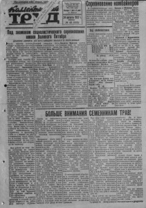 Пролетарии всех стран, coed Орган Карасукского Райкома ВКП(б) и Райисполкома Зап.-Сиб. края Выходит 1 разв6диен Ст. Карэсу* {Соревонвнаиекомбайнреов I г* ___________ ______ „___ I П л иш а и и П!йяяа»пп ( К я п я - 24августа1937г. ВТОРНИК М 45 (522) В социалистическом co-j Оришак и Шемя ков (Кара- ревновании имени 20-летияI сукская MTw колхоз Великой Октябрьской р е - , им. Степана Разина), убрав- волюции, в борьбе за право |шие на 20 августа двумя быть занесенными в крае- 1комбайнами,, Сталинец" 574 I вой список почета среди | га и заработавшие первый Q\JII \,uuw» uv ivIu v/л,»*i - —--(--- ---- — * комбайнеров нашего района 884 руб., второй -935 руб впереди идут товарищи: следующие Подзнаменем социалистического соревнования имени Великого Октября Ходхлеобпосатвок Прасолов и Ровонский (Карэсукская МТС, колхозы „Коллективный труд" и „Красная звезда"), убрав шие двумя комбайнами „Сталенец" 464 га и зара- Общее выполнение плана боташпие первый 784 руб. |хебопоставок по району второй- 716 руб. колхозами (включая воз- Бережной и Воронежская I I I I I w Щ Щ ■ ■ ^ чг ^ ■ w | I К vil Л U O U JA tt ivy iujji u I " '^ КОЛХОЗ .ОПОРА. ИЗ ОТСТАЮЩИХ ВЫШЕЛ В ПЕРЕДОВЫЕ £ « • $ £ £ * Л 7 РаГ /с7а августа колхоз Каждый старался быть Капусты Василия, достав-|^ npTaRTlffftT R nn0lieHTax: | двух комбайнах „Сталинец1 $ 21-го августа колхоз „Опора" полностью рассчи тался с государством по всем видам зернопоставок в том числе и по пред*яв ленным счетам за работу МТС на 581 центнер 82 килограмма. * История этой борьбы и завоеванной победы, как о ней рассказывает предсе датель колхоза Николай Оелифонович Черкасский, весьма поучительна. Она рождена историческим^ по становлением ЦК ВКШб) и Совнаркома СССР о Ку- лунде и социалистическим соревнованием имени XX летия Великого Октября. Вырастив на своих полях (•обильный урожай, колхоз- w hhkh еще задолго до хле бопоставок поставили пе ред собой неотступную за дачу выйти в передовые по выполнению своего дол га перед родным социалис тическим государством то время, как в соседних колхозах в первые дни активным участником эго го замечательного движе ния. Учетчик Мона Василий торопился поскорее выпол нить прямую работу и спешил на ток, где вместе со своим семейством-женой и подростками сыном и дочерью-становился к веял ке. Бригадир транспортной бригады Заяц Иван и его ближайшие помощники Вэак Федосий и Захарчаико Патр так построили свою работу, что на 50 процен тов перекрывали установ ленный график по транс портировке хлеба на элева тор. Вместо одного рейса в сутки—делали два. На паре лошадей за один рейс подымали по И цент неров хлеба. Чтобы не те рять дорогого время, транс портники приспособились получать на элеваторе за четные квитанции на сдан ный хлеб при повторных приездах, пока в лаборато ч вт составляет в процентах лявшее хлеб на элеватор к*аав»-в«ия МТС t на быках. Это звено сдела ло по одному с четвертью рейса на элеватор в сред нем за сутки. На каждой паре быков за один раз отправлялось по 12 и даже больше центнеров хлеба. И при всем этом тягло находится в хорошем со стоянии. Решением К зрасу *с *ая МТС Х»рошенакая Баденская > Лалецкзя и 41 " 442 га--по 221 га и зара- » —26,61работавшие первый 680 20 8 1руб., вторая—676 рублей. Папенко (Хорошенская МТС, колхоз* Большевист- 27,31с.кий путь"), убравший комбайном „Сталинец" 218 га и заработавший 750 руб. Загреба (Хорошенская *|МТС, колхоз „Красный По райзну й * # В печатней колонне пере доанкой похода имени 