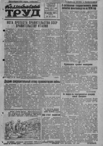 Пролетарий всех стран, соединяйп' л [!~д газет И издательсть ^СоМеейшМяй Т Р У Д \jyian 1 \луа\.] nv-nuiu и Райкома ВКП(б) и Райисполкома Зап.-Сиб. края Выходит 1 раз в 6 днгй Ст. Кзрэсук 14сентября 1937г. ВТОРНИК № 49 ( 526 ) НОТА ПРОТЕСТА ПРАВИТЕЛЬСТВА СССР ПРАВИТЕЛЬСТВУ ИТАЛИИ 6 сентября с. г, посоль с т в о СССР в Италии, гто поручению правитель ства СССР, препроводило министру иностранных дел Италии г, Чиано следую щую ноту протеста: «Посольство Союза Со ветских Республик в Ита -Jf лии обращает-внимание Ита льянского правительства на то, что в распоряжении Правительства Советского Союза имеются не подле жащие сомнению доказа тельства агрессивных дей ствий итальянских военных судов против торговых судов СССР. Указанные действия выразились в потоплении итальянским подводным судном совет- ^ с к о г о судна „Тимирязев", ^Следовавшего из Кардифа в Порт-Саид с грузом угля и атакованного 30 августа с.г. в 22 часа в 120 киломе трах к востоку от Алжира. Такое же нападение было совершено на советское судно „Благоев", направляв шееся из Мариуполя в Сетт с грузом пекка для асфальта и потопленное 1 сентября с. г. в 6 часов J ^ 3 0 минут в 15 милях от острова Скирос. Итальянское правитель ство, несомненно, учтет, что эти акты, совершенные по отношению к плаваю щим по открытым морским путям торговым судам Советского Союза, поддер живающего с Италией нор мальные дипломатические отношения, находятся в вопиющем противоречии не только с принципами гуманности, но и с самыми элементарными и обще признанными нормами меж дународного права. Вместе, с тем акты нападения итальянских судов на суда, плавающие под флагом СССР, нарушают пакт, зак люченный между СССР и Италией 2 сентября 1933 г. и предусматривающий в ста тье первой обязательство каждой договаривающей ся стороны перед другою „не прибегать ни в каком случае против нее, ни от дельно, ни совместно с одной или несколькими третьими державами, ни к войне, ни к какому-либо нападению на суше, на море или в воздухе...", Всилу изложенного выше. Посольство СССР заявляет Итальянскому правитель ству от имени и по поруче нию Правительство Союза ССР самый решительный протест. Правительство СССР возлагает на Итальянское правительство всю полно ту ответственности за по литические, а также мате риальные.последствия озна ченных агрессивных дей ствий итальянских военно- морских сил по отношению к торговым судам, плаваю щим под флагом СССР. Посольство СССР упол номочено Правительством Союза ССР настаивать на решительном пресечении этой агрессии в дальней шем и на полном возмеще нии ущерба, понесенного в результате этих актов Советским Союзом, а так же ущерба, понесенного моряками названных совет ских судов или их семьями, Посольство уполномочено также настаивать на при мерном наказании лиц, виновных в совершении упомянутых агрессивных действии". (ТАСС) 3 ? Крайкоме ВКП(б) и Крайисполкоме О составлени госудтваернсного плана раизвтяи животноводства на 193Вгод Дадим сокрушительный отпорпровокаторамвойны Мы колхозники и кол хозницы колхозов им. Во рошилова, „Память Куйбы шева", рабочие и служа щие МТС, село Белое, соб рались на митинг в коли честве 200 человек, глубо ко возмущены бандитски ми действиями распоясав шегося итальянского фа шизма, потопившего в кро ви абиссинское население, убивающих мирных жите лей, детей, женщин и ста риков Испании, сей