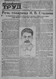 Пролетарии всех стран, соединяйi Т Р У Д Н. Сиб .1 ipcfc Дом советов уп- J п-д га зет и издательств (1- э#з), . края Выходит 1раз в6 дней Ст. Караеук 18декабря1397г, СУББОТА 6 7 ( 5 4 4 ) ^ J право избирателей состоят ни все время держали под контролем своих депутатов и чтобы они внушали им—ни в коем случае не спускаться до уровня политических обывателей, чтобы они—избиратели внушали своим депутатам —быть такими, каким был великий Ленин*. (И СТАЛИН) Речь товарища И. В. Сталина на предвыборном собрания избирателей Сталинского избирательного округа города Москвы 11 декабря 1937 года в Большом театре ПРЕДСЕДАТЕЛЬСТВУЮЩИЙ. Слово пре доставляется нашему кандидату товарищу Ста лину. ПОЯВЛЕНИЕ НА ТРИБУНЕ ТОВАРИЩА а СТАЛИНА ВСТРЕЧАЕТСЯ ИЗБИРАТЕЛЯМИ БУРЕЙ о в а ц и й , к о т о р а я ДЛИТСЯ в ТЕЧЕНИЕ НЕСКОЛЬКИХ МИНУТ. ВЕСЬ ЗАЛ БОЛЬШОГО ТЕАТРА СТОЯ ПРИВЕТСТВУЕТ ТОВАРИЩА СТАЛИНА. ИЗ ЗАЛА НЕПРЕ РЫВНО РАЗДАЮТСЯ ВОЗГЛАСЫ: „ДА ЗДРАВ СТВУЕТ ВЕЛИКИЙ СТАЛИН. УРАГ‘, „ТВОРЦУ САМОЙ ДЕМОКРАТИЧЕСКОЙ В МИРЕ СО ВЕТСКОЙ КОНСТИТУЦИИ ТОВАРИЩУ СТА ЛИНУ, УРА“, „ДА ЗДРАВСТВУЕТ ВОЖДЬ УГНЕТЕННЫХ ВСЕГО МИРА ТОВАРИЩ СТАЛИН, УРА!“. СТАЛИН. Товарищи, признаться, я не мел намерения выступать. Но наш уважае мый Никита Сергеевич, можно сказать, сил ком притащил меня сюда, на собрание: скажи, говорит, хорошую речь. О чем сказать, какую именно речь? Все, что нужно было сказать перед выборами, уже сказано и пересказано в речах наших руководящих товарищей Кали нина, Молотова, Ворошилова, Кагановича, Ежо ва и многих других ответственных товарищей. Что еще можно прибавить к этим речам? Требуются, говорят, раз'яснения по не которым вопросам избирательной кампании. Какие раз'яснения, по каким вопросам? Все, ^лто нужно было раз'яснить, уже раз'яснено и яерераз'яснено в известных обращениях пар тии большевиков, комсомола, Всесоюзного Центрального Совета Профессиональных Сою зов, Осоавиэхима, Комитета по делам физкуль туры. Что еще можно прибавить к этим раз' яснениям? Конечно, можно было бы сказать этакую легкую речь обо всем и ни о чем. (ЛЕГКИЙ СМЕХ), Возможно, что такая речь позабавила бы публику. Говорят, что мастера по таким речам имеются не только там, в капитали стических странах, но и у нас, в советской стране. (СМЕХ, АПЛОДИСМЕНТЫ). Но, во- первых, я не мастер ио таким речам. Во-вто рых, стоит ли нам заниматься делами забавы теперь, когда у всех у нас, большевиков, как говорится, „от работ полон рот“. Я думаю, что не стоит. Ясно, что при таких условиях хорошей речи не скажешь. И все же, коль скоро я вышел на трибу ну,, конечно, приходится так или иначе сказать хотя бы кое-что. (ШУМНЫЕ АПЛОДИСМЕН ТЫ). Прежде всего я хотел бы принести бла- ■^ггодарность (АПЛОДИСМЕНТЫ) избирателям за доверие, которое они оказали. (АПЛОДИС МЕНТЫ). Меня выставили кандидатом в депутаты, и избирательная комиссия Сталинского округа советской столицы зарегистрировала меня как кандидата в депутаты. Это, товарищи, боль шое доверие. Разрешите принести вам глубо кую большевистскую благодарность за то до верие, которое вы оказали партии большеви ков, членом которой я состою, и лично мне, как представителю этой партии. (ШУМНЫЕ АПЛОДИСМЕНТЫ). Я знаю, что значит доверие. Оно, естест венно, возлагает на меня новые, дополнитель ные обязанности, и, стало-быть, новую, допол нительную ответственность. Что же, у нас, у большевиков, не принято отказываться от от в