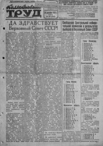 I Пролетарии всех стран, соеди; * 1 ^ — ПОСТАНОВЛЕНИЕ ПРЕЗИДИУМА ЦЕНТРАЛЬНОГОИ0П0Л- — L ^ --------- ---------------- Ч " ^ асукского 1 ДАТЕЛЬНОГО КОМИТЕТА СОЮЗА ССР О СОЗЫВЕ ПЕР- Н. Сибирск Дом В0И СЕССИИ ВЕРХОВНОГО СОВЕТА СССР п'Д,гавеГ и издатечь^Т&п ^п" НрезиДиУм ЦИК СССР на основании статьи 55 v• с1 * ( I экз) зтитуции СССР постановляет: Созвать первую сессию Верховного Совета Союза Советских Социа листических Республик 12 января 1938 г. в г. Москве. Председатель Центрального Исполнительного комитета Союза ССР М. КАЛИНИН Секретарь Центрального Исполнительного Комитета Союза ССР А. ГОРКИН Москва, Кремль, 19 го декабря 1937 г. ТРУД Ст. 1Йфае,у I 24декабря1937г. , пятница „ М 68 (545) J ДА ЗДРАВСТВУЕТ Верховный Совет СССР! '%! Закончилась самая серьезная, самая массовая из политических кампаний, происходивших за все го ды советской власти,—вы боры Верховного Совета ^ СССР. День 12-го декабря явился блестящим завер шением двух замечатель ных месяцев невиданной в истории избирательной кампании. Весь мир в этот день следил за ходом вы боров в Верховный Совет —друзья с восхищением и радостью, враги—с зубов ным скрежетом и бессиль ной злобой. Во всей не- * об‘ятной нашей стране, в городах и селах, на дале ком Севере и солнечном Юге, на зимовках и в ко чевьях—везде, где живут советские люди, на всех 137185 избирательных уча стках Советского Союза день 12-го декабря прошел с особой торжественностью и праздничностью. Вели кий советский народ, сво бодный и могучий, выбрал высший орган государ ственной власти. Выборы прошли под знаком бес предельного доверия, по казанного народом партии большевиков—партии, ко торая всегда жила и жи вет жизнью своего народа, у которой никогда не бы ло и не будет иных инте ресов народа—его счастья и благополучия. На выбо рах в Верховный Совет СССР коммуниссы высту пали в блоке, в союзе с беспартийными. Блок ком мунистов и беспартийных одержал блестящую побе ду! Первым своим депута том, волей всего народа, избран великий Сталин— вождь, друг и учитель всего трудящегося чело вечества. выборов и такого едино душного голосования. Нет такого челозека в Совет ской стране, который не почувствовал бы в день 12-го декабря, насколько сильна любовь советского народа к своей родине, к своей партии, к своему вождю товарищу Сталину. В выборах в Верховный Совет СССР участвовало 96,5 проц. избирателей, Это значит, что почти все граждане СССР, по призы ву партии Ленина-Стали на и советской власти при шли к избирательным ур нам. Это значит, что 12-го декабря все население СССР отдало свои голоса непобедимому сталинскому блоку, союзу коммунистов и беспартийных. Ни в од ной капиталистической стране немыслимо то еди нодушие, с каким голосо вали люди Советской стра ны за кандидатов. Пого- В числе избранных -б л и жайшие соратники Стали на, его передовые и вер ные ученики, руководите ли партии и правитель ства. В Верховный Совет СССР избраны знатные стахановцы промышленнос ти, герои колхозного тру да, ученые с мировым именем, славные команди ры Красной Армии, лучшие учителя наших детей, сло вом, самые передовые лю ди, цвет советской родины. Депутаты всех без исклю чения 1143 избирательных округов были кандидатами блока, союза коммунистов и беспартийных. Мир ни когда еще не видел таких ■т ловчая .явка ,.и, выборы, дружное голосование за кандидатов единого блока! В Англии с ее хваленой буржуаз