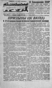 Прест арau re ts m t e v гоШ няйваей ОРГАН КАРЛСУКСКОГО Рк ВКП(б) а РИК'а НОВОСИБИРСКОЙ ОБЛАСТИ ^ 1 1—^^11 - Пятница 3 ноября 1944 года В Совнаркоме СССР Ввиду того, что вторник 7 ноября и среда 8 ноября 1944 года являются не рабочими днями, Сов - нарком СССР постановил, в соот ветствии с многочисленными поже ланиями трудящихся считать во скресенье 5 ноября 1944 года рабо чим днем . ПРИЗЫВЫЦК ВКП{6) К 27-эягодовщинеВеликойОктябрьскойСоциаилситчсекйореволюци 1. Да здравствует 27-я годовгцива Великой. Октябрь ской социалистической революции, свергвувшей власть империалистов в нашей страве и создавшей могучую Советскую державу— основу свободы и независимости народов СССР, оплот мира между народами! 2. Трудящиеся Советского-Союза! Красная Армия вышибла немецко-фашистских захватчиков из пределов нашей Родины. Да здравствует наше свободное совет ское Отечество! Да здравствует героическая Красная Армия— армия освободительница! 3. Да здравствует доблестная Красная Армия, громящая гитлеровских захватчиков на территории Германии! Воины великой Советской державы! Вперед на Запад! Добьем фашистского зверя в его берлоге! 4. Покараем немецко-фашистских извергов за раз грабление и разрушение наших городов и сел, за насилия над женщинами и детьми, за убийства и увод ь немецкое рабство советских людей! Мщение в смерть фашистским' злодеям! о. Да здравствует победа англо-соввтско-американ- ского боевого союза над злейшими врагами человече ства— немецко фашистскими захватчиками! Все силы и боевую мощь объединенных наций- на быстрейший разгром гитлеровской Германна! Разрушим раабоничье гнездо фашистских людоедов и обеспечим прочный мир между народами всего мира! 6. Привет доблестным войскам Великобритании и Соединенных Штатов Америки, громящим гитлеровские оодчища в Западной Европе! Привет храбрым английским и американским морякам, борющимся против фашист ских пиратов! 7. Привет югославскому народу! Да здравствует героическая народно-освободительная армия Югославии, длечом в плечу с Красной Армией освобождающая свою родину от немецких поработителей! ' 8. Привет польскому народу, борющемуся против немецко-фашистских захватчиков! Патриоты Польши! Всеми силами помогайте вашим освободителям— Крае вой Армии а Польскому войску быстрее разгромить ненавистных немецких оккупантов! Да здравствуют доблестные солдаты п офицеры Польского войска! 9, Привет французскому народу, вместе с союзными армиями завершающему освобождение Фравции от германского ига! Боевой привет доблестным летчикам- фравцувской авиационной части «Нормандия», совмест но с советскими летчиками громящей немецко-фашист ских варваров! 10 . Привет чехословацкому народу, борющемуся против немецко-фашистских извергов! Патриоты Чехо словакии! Все силы на помощь Красной Армии, освобо ждающей вашу родину от гитлеровских захватчиков! Боевой привет солдатам и офицерам чехословацкого корпуса, борющегося вместе с Красной Армией против немецко-фашистских угнетателей! 11. Привет народам Европы, борющимся против гитдеровского империализма! Патриоты европейских стран, угнетенных немецко-фашистскими поработителя ми! Поднимайтесь на борьбу за свое освобождение от фашистского ига! Долой гитлеровскую тиранию! 12, Братья славяне! Все силы на разгром немецких захватчиков— смертельных врагов славянства/ Да з