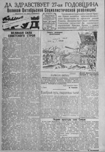 ДА ЗДРАВСТВУЕТ 27-ая ГОДОВЩИНА Великой Окятбрьской Социалистической революции! Пролетарии всех стран, соединяйтесь'- чдота' Г Орган КарасукскогД| Райкома ВКЩб) * н Районного Совета депутатов трудящихся Новосвйирской области выходит 1 раз I наделю цена номера 15 «он, 7 ноября 1944 г, Вторник \ ^ M 4 2 ; a n t J Трудящиеся Советского Союза! Крас ная Армия вышибла немецко-фашист ских захватчиков из пределов нашей Родины. Да здравствует наше свободное Советское отечество! Да здравствует героическая Красная Армия — армия „ „ „ „ I (Из призывов ЦК ВКП(б) к 27-ой О С В О О О Д И Т е Л Ь Н И Ц а 1 годовщине Великой Октябрьской-со циалистической революции). ВЕЛИКАЯ СИЛА СОВЕТСКОГО СТРОЯ Война, навязанная нашему на роду немецко-фашистскими зах ватчиками, явилась всенародным испытанием силы и прочности советского государства, суровой проверкой единства и сплочен ости советских людей. „История войн учит,—говорил оварищ Сталин,—что лишь те го сударства выдерживали это испы таки*, которые оказывались силь нее своего противника но раз витию и организации хозяйства по опыту, мастерству и боевому духу своих войск, по выдержке, единству народа на всем протя жении войны. Именно таким государством является наше го сударство*. Развязывая войну против Совет ского Союзз.немецкие захватчики считали, что они также быстро покончат с нашей страной, как покончили со многими другими европейскими государствами. На деле же оказалось, что советское государство выдержало все испы тания воины, а гитлеровская Германия стоит перед неминуе мой катастрофой, которая уже ке за горами.' Героическая Красная Армия спасла наш народ от угрозы фа щнстского порабощения, отбро- чла захватчиков за пределы на лей Родины, бьет врага на его территории.Советские воины выз воляют из гитлеровской неволи Народы Польши и Балканских стран. Красная Армия обеспечи ла нашим союзникам возможность развернуть успешную борьбу про тив немцев на юге и на западе. Теперь Германия, стремившаяся завоевать весь мир, сама оказа лась в железных клещах совет ских и англо-американских войск. В чем заключается секрет ус пехов советского народа, откуда у него взялись силы, чтобы ус- Тоять против вооруженного до зубов противника и нанести ему поражение? Секрет этих успехов заключает ся в том, что великая социали стическая революция в октябре 1917 года коренным образом изменила лицо нашей Розины. В нашей стране навсегда уничто жена национальная рознь между народами.Коымунистическая пар тия. и советская Еласть сплотили весь народ в единый союз рабо чих, крестьян в интеллигенции. В результате сталинской политики индустриализации СССР пре вратился в несокрушимую кре пость, могучую индустриальную и колхозную державу. С каждым годом все лучше и краше стано вилась жизнь. Советский народ, как любимое детище, растил и укреплял свою Красную Армию, зная,что в час суровых испытаний советские воины с честью будут защищать свое отечество. Война прервала наш мирный труд. Рабочие, колхозники и интеллигенция вынуждены были поставить на службу фронту все народное хозяйство страны, чтобы обеспечить Красную Ар мию всем необходимым для по беды. Советские люди хорошо запомнили сказанные еше в пер вые дни войны слова тов. Сталина о том, что дело идет о жиз ни и -смерти народов СССР. Быть народам Советского Союза свободными или впасть в п