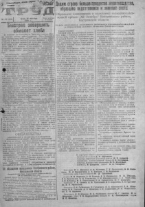 i Новосибирск, О б ком п а р т и ' « П , ^ п е ч а т и « * F * f JVS 5 5 ( Р 2 « ) Срэда, 28 сентября 1345 г, Цена номера 15 копеек Быстрее завершить обмолот хлеба За последние дне пятиднев ки колхозы нашего района резко снизили сдачу хлеба го сударству. С 10 по 15 сентября на пункты заготзерно вывезено всего лишь ,4156 центнеров вместо 10470 по заданию В четвертую пятидневку сдали ц того меньше—2264 цент нера. Срыв пятидневных заданий но вывозке хлеба государству в большинстве колхозов зави сит исключительно по причине плохой организации молотьбы. Колхозы Че-рдА-Курьияекого сельсовета (председатель тор . Й ^ я к с ) в третьей пятидневке <И ^ ;яы были сдать государ ству 950 центнеров, а едали только ЗСО. В четвер тей пятидневке сдачу резко сократили, вывезли на склады вагот.-ерно всего лишь 10 1 цептнеров.Колхоз «II выйстрой» в течении- десяти даеВ в сдаче хлеба совершенно не участво вал. Однако он имел полную возможность сдавать хлеб бес перебойно. Основная причина здесь кбоется в молотьбе. В «Новом строе - более 2.00 га хлеба подлежит обмолоту, но молотьба не двигается из-за плохой работьькомбайнз. Колхоз - , 1 № Г строй-* :ь Черно-Курьинской МТС—не пс- ислючение. Не организована Д л о т ь б а я в других артелях. В ■ р х о з е Новая семья» подле ж и т обмолоту 160 га, в имени Куйбышева—143, в «Комин терне»—около 160 га. Дирек- т р МТСтов. Агапов, секретарь парторганизации тов. Хисмату- лин и член бюро райкома ВКП б)тов. Верлов, закреплен ный за этой МТС, решитель ных мер к улучшению работы комбайнов не принимают, Ведь на самом деле, колхозы, обслу живаемые Черно Курьинской МТС две- трети урожая убрали простыми машинами, а комбай ны почти весь период уборки бездействуют. Спрашивается, чем занимаются руководители станции? Они примирились с фактами антигосударственной практики в отдельных колхо зах, направленных на срыЕ выполнения государственного плана хлебопоставок, притупи ли большевистское чутье и не принимают должных мер к срывщикам хлебосдачи. Руководители Палецкой М1С также ка к и Черно-Курьин- ской Плохо организуют работу комбайнового парка. В резуль тате в большинстве колхозов комбайны простаивают, обмо лот не идет и этим са*нм торйозит своевременную сд Учу хлеба государству. Однако за крепленный за этой МТС член бюро райкома ВКЩб) т^в. Трах»мешу; мирится с н‘9Д*-б- ными л ами в не требует етввтстве.-:зости с руководи телей МТС за -четкую .и Слс- работу ком бай- перебойную 'нов. Обмолот хлеба сейч гс решает судьбу сдачи з^о- на госу оарCm пу .''Жо дол-, жны твердо учесть каждый председатель колхоза и сельсо вета, директора МТС, руко водители партийных и комсо мольских организаций. Надо принять все необходимые ме ры, использовать все возмо жности к резкому усилению обигелота и хлебосдачи госу дарству. В этом сейчас главная и основная за - дача. Обмолот хлеба к 1 ок тября должен быть во чтобы то ни стало закончен, ОБЯЗАТЕЛЬСТВА колхозников и колхозниц сельхозартели «Коллективный труд » Майского сельсовета В ответ на победы красной Армии, обеспечившей аир во всем мире и на призыв крас нодарских и московских хлебо робов мы, колхозники и колхоз ницы сельхозартели «Коллек- таваый труд» включаемся в предоктябрьское соцаалистиче- ское соревнование и берем ва себя следующие обязательства: 1. Годовой государственный план хлебосдачи полаостыо в днолнить в 27 сентября и к 5 октября сдать сверх плана 