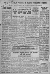 ■J&Л HE £>'Ч',лГЬ,А УСИЛИВАТЬ ТЕМПЫ ХЛЕБОЗАГОТОВОК! ------- --------------------- — ---- — — --------------------------- ----------------------------------------------------------------------------------- *® ..idftIO День встретим великий праздник Мы находимся накануне 28 годовщины Великой Октябрь ской социалистической рево люции. Советский народ слав ную годовщину Октября в этом году будет отмечать осо беино радостно, ибо 1945 год является годом победоносно го завершения войны против фашисткой Германии и япон ского империализма, годом за воевания всеобщего мира во всем мире, Трудящиеся нашей страны готовясь достойно встретить зна менательную дату—день 7 ноября—отдают все свои силы на дело восстановления народ ного хозяйства, на „еще бол ь шее экономическое Двоенное укреплевие своей любимой Родины. Передовой коллектив фабрики имени Ц!£ швейников города Новосибирска обратил ся с предложением ко всем трудящимся нашей области начать предоктябрьское со циалистическое соревнование за достижение новых успехов в промышленности и сельском хозяйстве. Его предложение горячо подхвачено всеми трудящимися области. Колхозники и колхозницы, все специалисты сельского хо зяйства Венгеровского района включившись в предоктябрь ское соревнование решили го довой план хлебозаготовок полностью выполнить к 20 октября. В своем обязатель стве венгеровцы пишут: «Мы призываем колхозников и колхозниц, рабочих МТС и сов хозов, специалистов сельского хозяйства нашей Новосибирской области активно включиться в предоктябрьское социалис тическое соревнование и до стойно встретить всенародный праздник — 28-ю годовщину Великой Октябрьской с щцалис- тической революции. По почину венгеровцев в предоктябрьское соревнование вступили и передовые колхозы нашего района имени Стали на, имени Петровского, „Впе ред к коммунизму” и др. По хлебосдаче эти колхозы пол ностью рассчитались с госуда рством, а сейчае усиленно' на ваготпувкш вывозят карта- фель, овощи и другие" сель ■^Еохозяйственные продукты, Работники животноводства этих артелей готовят скоту сытую и теплую зимовку'. Скотные дворы полностью от ремонтированы— в них хоть сейчас загоняй„скот. Больше чем на пол зимы подвезено к фермам кормов. Предоктябрьское социалис тическое соревнование должно протекать под лозунгом по лного завершения уборки в ближайшие дна, досрочного выполнения плана хлебосдачи, картофеля, овощей государст ву, создания для скота сы той и теплой зимовки. и ночь готовить и отгружать зерно государству! В н д о т в т ь Пролетарии всех страну соедикяйтёсь\ Ю зиие&пиб/шй г т ш > Орган Карасукского райкома ВКЩб) и районного Совета депутатов трудиц яхся> Новосибирской обдаст* Выходит 1 раз в неделю цена номера 15 коп, 6 октября 1945 г, Суббота' № 39 (931) Обязательство взяли, но не выполняют Колхозника сельхоз артели «Майское утро» включаясь во Всесоюз ное социалистическое соревнование брали на себя обязательство к 10 сентября полностью с высоким качеством убрать урожай, к 20 сентября рассчитаться с государством но хле бопоставкам и натур оплате за работу МТС. Бохоз имел полную выпбл- сена возможность нить свое обязательство как по уборке, так и по хлебосдаче. Урожай здесь хороший, рабо чей силы достаточно, но на уборке участ вуют 18-20 человек из 80 трудоспособных кол хозников. Трудовая дис циплина исключитель но расшатана. Много колхозников совершенно не выходят 