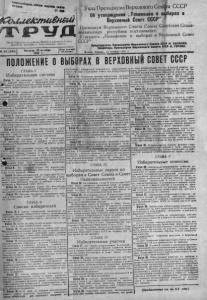 % £ !* * * " * * партии свито О шт ч &Ьиие&пи£нбМ ¥ Д Орган Карасукского райкома ВКП(б) и районного Совета депутатов трудящихся, Новосибирской облает Пятница, 26 октября 1945 г. I Цена номера | 15 копеек. Указ Президиума Верховного Совета СССР Об утверждении „Положения о выборах в Верховный Совет СССР" / Президиум Верховного Совета Союза Советских Социа- мистических республик постановляет. _ Утвердить „Положение о выборах в Верховный Совет СССР" • Председатель Президиума Верховного С о в е т а м- КГоркИНИ* Секретарь Президиума Верховного Совета СССР А. ГОРНИМ. Москва, Кремль. VS 42 (934) т а,^ кт j / _ Москва> Кремль. ц октября 1945 г. .... ■ — — ПОЛОЖЕНИЕ О ВЫБОРАХ В ВЕРХОВНЫЙ СОВЕТ СССР - « в 1 ' ч н / я л й аЙМНА O f * - Г Л А В А I Избирательная система Статья 1. На основании статьи 134 К онституции ССР выбор1*1 депутатов в Верховный Совет СЬОг Возводятся избирателями на основе всеобщего, разного прямого избирательного права при тайном голосова- 1Н. СтаТЬЯ 2- На основании статьи 135 Конституции !ССР выборы депутатов являются всеобщими: все раждане СССР, достигшие 18 лет, независимо от расо- ой^и национальной принадлежности, пола, вероиспове- образовательного ценза, оседлости, социального г^Иождения, имущественного положения и прошлой еЗ т ь н о с ти , имеют право участвовать в выборах епутатов в Верховный Совет СССР, за исключением малишенпых и лиц, осужденных судом с лишением юбирательных прав. СТЛЬЯ 3. Депутатом Верховного Совета СССР может >ыть избран каждый гражданин СССР, достигши» 23 лет, ^зависимо от расовой и национальной принадлежности, юла, вероисповедания,обрааовательяогоценза, оседлости, социального происхождения, имущественного положения 1 прошлой деятельности. СтаТЬ4Я. Ва основании статьи 136 Конституции СССР наборы депутатов являются равными: каждый гражда- 1 нн имеет один голо с ; все граждане участвуют в выборах ! Верховный Совет СССР на равных основаниях. Статья 5. На основании статьи '37 Конституции 'ССР женщины участвуют в выборах и могуг быть Убранными в Верховный Совет СССР ца равных правах ; мужчинами. СтаТЬЯ6, На основании статьи 138 Конституции С С С Р граждане, состоящие в рядах Красной Армии, пользуются правом избирать и быть избранными в Верховный Совет СССР наравне со всеми гражданами. S ITbfl 7- На основании статьи 139 Конституции СССР ы депутатов являются прямыми: избрание депутатов ховный Совет СССР производится гражданами бедственно путем прямых выборов. СтаТЬЯ8 На основании статьи 140 Конституций СССР голосование при выборах депутатов в Верховный Совет СССР является тайным. СтаТЬЯ9. Лица, проживающие на территории СССР и ые являющиеся гражданами СССР, а состоящие в граж данстве или подданстве иностранных государств, не имеют права принимать участие , в выборах и быть из бранными в Верховный Совет СС ,-Р. Статья 10. На основании статьи 141 Конституции СССР кандидаты при выборах в Верховный Совет СССР выставляются по избирательным округам. СТЯТЬЯ И - Расходы, связанные с проведением выбо ров в Верховный Совет СССР производятся за счет государства. ГЛАВА II Списки избирателей обеспечивает избирателям возможность ознакомления с этими списками в помещении Совета или избирательного участка. СтаТЬЯ 19. Подлинник списков избирателей хранится соответственно в Совете депутатов трудящихся и в воин ской части или в войсковом соединении. Статья 2S. При перемене из