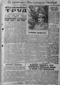 4W Да здравствует 28-я годовщина Октября! Пролетарии всех стран , еоейщдйтесь1 ; %Ьиие&ти#н$ш э ж / Д Орган Карасукского райкома ВКП(б) и районного Совета депутатов трудящихся, Новосибирской области. М 44 {936) 7 нойбря 1945 г. Цена номера 15 копеек. ПдозноиенемДенине,повдодительством] Сталина—вперед к новым небелом! 9 В этом году советский 28-ю годовщину Великой Октя брьской социалистической рево люции празднует с чувством особого, небывалого еще во одушевления и под“ема. Эго и понятно, ибо 28-я годовщина Октябрьской революции—наш первый послевоенный Октябрь, отмеченный победоносным за вершением Великой Отечествен ной войны. народ |ция преобразила нашу страну. Разумеется, что старая, дорево люционная Россия не могла бы устоять под натиском гитлеров ской Германии, гораздо более! мощного и опасного противника | чем Германия времен первой, мировой войны. Празднуя 28 ю годовщину Вели кого Октября, советский народ) удовлетворением и гордостью Минувшая война была для советского государства таким суровым и серьезным испыта нием, подобно которому оно еще не знало. Эго испытание не только целиком подтвер дило правильность и мудрость того исторического пути, на ко торый вывела нашу страну Великая Октябрьская социалис тическая революция. Проверка войной показала вместе с тем, что только в Октябрьской революции было спасение на шей Родины, только победа, одержанная- народом под руко водством партии Ленина-Сталина в революционных битвах осени 1917 года, могла обеспечить и обеспечила победоносный исход ВеЛикой Отечественной войны 1941-1945 г. г. Страшно подумать, какая горькая участь постигла бы наше Отечество, если бы Ленин и Сталин, партия большевиков ие подняли народ на Октябрь ское революционное восстание и не привели бы его к созда нию советской власти! Известно, чго под властью эксплоататоров Россия все более отставала своем развитии от передовых в экономическом отношении стран мира и ввиду этого все бо лее впадала в кабалу иностранных государств. Великая Отечественная война против немецко-фащистких за хватчиков особенно полно рас крыла все неоценимое значение и гигантскую роль Октябрьской революции для судеб нашего народа, для судеб всего челове чества. Именно благодаря исто рическим завоеваниям Октя бря советский народ сумел с честью и славой выполнить свою благородную освободитель ную миссию в б о р ь б е с фашистской агрессией и тира нией, Социалистическая револю- подытожит пЛоды наших замеча тельных побед на полях битв. | Сила нашего оружия, доблесть, ПОДАРКИ ОКТЯБРИ» Выполнили план аеставох продукте* животноводства Колхозники сельхозартели „Вос ход зари“, Майского сельсовета радостно встречают 28-ю годов щину Октябрьской революции. Колхоз полностью рассчитался с государством по всем видам поставок продуктов животновод ства. Мяса сдано 51 центнер иди 164 процента к плану. Плав молокосдачн выполнен на 101,» процента. Шерсти сдано 337 килограммов, вместо 202. План яйцепоставок так же выводим на 145 процентов. Кроме этого, колхоз рассчитался с государст вом но поставкам картофеле. План картофелепоставок выпол нен на 116 процентов. А. Пеанов. и мастерство наших воинов, мудрость Верховного Коман дования Красной Армии ликвиди ровали угрозу немецкого наше ствия на нашу страну с запада японского нашествия с восто- Любимая профессия ка и смыли черное пя