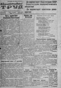 Пролвт аряя всех стран, соединя5кесъ\ 16 Ь и а £ & т и В н т 4 л г \ Орган Карасукского райкома ВКП(б) и районного Совета депутатов трудящихся, Новосибирской области № 48 ( 940 ) Среде, 5 декабря 1945 г. Цена номера 15 копеек Да здравствует Конституция СССР -Конституция социалистического общества! Да здравствует советская демо кратия! Пусьт здравствует Стаилнксаяконституция! Лея не; (Жил Девять дет назад— 5 дека бря 1936 года, Чрезвычай ный VIJI Всесоюзный с'езд Со ветов принял Основной Закон нашего государства, великую Сталинскую Конституцию. Этот фссмертаый исторический до кумент просто и сжато запе чатлел в своих статьях вели чественные итоги того пути, который прошла наша страна под водительством партии нива— Сталина. ды, истекшие со дня при- и утверждения Сталин ской Конституции, принесли наглядное подтверждение мо гущества нашей Родины, проч ности и незыблемости советско го строя. Победа советского народа в его борьбе с немецкими и японскими империалистами — это, победа Сталинской Кон статуции. Народы Советского Снова, руководимые партией Ленина— Сталина и своим любимым вождем Генералисси мусом Сталиным, спасли евро пейскую цивилизацию от фа шистских погромщиков. ойна erne более укрепила мощь нашего социалис- еского государства. Она е сильнее сплотила союз рабочего класса и крестьянст ва, закалила дружбу народов Советского Союза, упрочила социалистическую демократию. 10 февраля 1946 года совет ский народ второй раз будет избирать Верховный Совет СССР на основе Сталинской Конституции, на началах раз вернутого социалистического демократизма. В этих всена родных выборах будут участ- ^JBoflHi рСлу в Ж вовать народы всех иаших союзных республик. Избирательная платформа, с которой идет к выборам пар тия Ленина— Сталина, поддер живается всем народом. Это— борьба за скорейшее восста новление всего разрушенного войной и дальнейшее развитие нашего народного хозяйства, это— борьба за дальнейшее укрепление социалистической демократии, за дальнейший рост культуры, науки, техни ки, за укрепление военно-эко номического могущества Роди ны, за мир и безопасность на родов. Сталинская K ohctutj ция яв ляется документом свидетель ствующим <о том, что то, о чем мечтали и продолжают мечтать миллионы честных людей в капиталистических странах — уже осуществлено в СССР» (Сталин), Дчмня об этом, советские люди полны чувства гордости,заревою со ветскую власть, засвою Роди ну, за свои no6ej(Wsa Сталин скую Конституцию* Н>вые грандиозные перс пективы развития раскрыва ются перед нами сейчас— на пороге первой послевоенной сталинской пятилетки. Под знаменем Сталинской Консти туции мы победили, под этим знаменем будем итти вперед за дальнейшее развитие нашей любимой Родины, за повыше ние жизненного уровня трудя щихся, — Пусть здравствует Сталин ская Конституция! И пусть ■здравствует ее творец— наш учитель, наш отец, наш вождь товарищ Сталин! Подарок дню Конституци Образцово подготовиться к ве сеннему севу 1946 года, больше задержать снега на полях—за это борются колхозники сельхоз артели „Кавказский трудовик", готовясь к выборам в Верховный Совет СССР. Включившись в соревнование в честь дня Сталинской Консти туции, члены этой артели не те ряя времени ведут борьбу за на копление влаги на полях. >5 но ября в колхозе был проведен воскресник по снегозадержанию, в котором уча