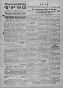 Пролетарии всех стран, соединяйтесь! Орган Кар асунекого райкома ВКП(в) и районного Совета депутатов трудящ ихся, Новосибирской област и .___ I ЧЕТВЕРГ, | № 28 (1 1 ЗЬ) | 8 АПРЕЛЯ 1948 ГОДА ' Цена номера 15 копеек Указ Президиума Верхопного Совета СССР О присвоении званияГерояСоциалистического Труда работником совхозов Министерства совхозов ССР по Новосибирскойобласти » В соответствии с Указом Президиума Верховного Совета СССР от 29 марта 1947 года за получение высоких урожаев ржи при выполнении совхозом плана сдачи государству сельскохозяйственных продуктов в 1947 году и обеспеченности семенами зерновых культур для весеннего сева 1948 года присвоить звание Героя Социалистического Тоу- da с вручением ордена Ленина и золотой медали Серп и молот*'. 1. БЕРЕЗИКОВУ Якову Акимовичу--директору зернового совхоза «Завьялов- ский», получившему урожай ржи 30,8 центнера с гектара на площади 81 гектар. 2. ИЛЬИНУ Николаю Алексеевичу старшему агроному зернового совхоза «Завьяловский», получившему урожай ржи 30,8 центнера с гектара на площади 81 гектар. 3. КИШКИНУ Андрею Петровичу — управляющему отделением зернового совхоза «Завьяловский», получившему урожай ржи 30,8 центнера с гектара на площади 81 гектар. 4. КОКОРИНУ Леониду Петровичу—звеньевому зернового совхоза «Завьяловский», получившему урожай ржи 31,3 центнера с гектара на площади 39 гектаров. 5. НАГИШЕВУ Павлу Ивановичу -звеньевому зернового совхоза «Завьяловский», получившему урожай ржи 30,36 центнера с гектара на площади 42 гек- та ра. Председатель Президиума Верховного Совета СССР / / . шв е р нт с . Секретарь Президиума Верховного Совета СССР А. ГОРКИН. Москва, Кремль. 1 апреля 1918 г.' Пионеры в помощь совхозу Пионеры семилетней школы совхоза имени Дзержинского решили помочь рабочим в выращивании богатого урожая. Для этого они создали звено из 18 человек. Руководить им стала пионервожатая тов, Рассо- ловй. Дирекция совхоза отвела| звену участок площадью в| 8 гектаров. Еще с зимы! пионеры приступили к сбору золы и птичьего помета. Сейчас они учатся, как и в каком количестве вносить удобрения в почву, часто! ооращаются за советами совхозному агроному. к Свой участок пионеры решили засеять классными семенами. С этой целью они организовали ручной отбор зерна: уже приготовлено 6 центнеров. Сейчас звено ведет наблюдение за нолем, чтобы не упустить талые воды. Как только участок освободится от снега, пионеры разбросают но нолю навоз и внесут в почву другие удобрения. На своем участке пионерское звено обязалось вырастить урожай пшеницы по 150 пудов с каждого гектара. Н. Близнюк. Электричество в домах колхозников Закончилось строи-\ Колхоз приобрел р а - тельство и оборудэва- даоаппаратуру . К о л х о з- ние электростанции в ника сельхозартели ре- колхо зе „Пятилетка*, шили: в течение лета 2 апреля в колхозном нынешнего года ввести кл уб е, конторе, на жи- в эксплоатацию радио- вотноводчеекпх фермах у з е л , радифицировать и и в домах колхозников телефонизировать к о л- ярко загорелись лампоч- Х03 ки Ильича. Мощность электростанции 35 ки ловатт. Д. Пестов. Колхозник артели „Пятилетка''. В лесоторговом складе 0 мая месяца 1947 года в Карасуке функционирует лесоторговый склад. За прошедший период он реализовал среди колхозов, колхозников, рабочих и служащих района более 1000 кубометров дров, много мебели и других деревянных изделий. Сейчас 