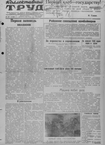 lCbuueJcmu#HMi ГЩ\ СЭ шШт Sm k Орган Kapacyнекого райкома ВКП(б) и районного Совета депутатов трудящихся, Новосибирской области. М 58 (1166) ВОСКРЕСЕНЬЕ. 1 АВГУСТА 1948 ГОДА Цена номера 15 копеек государству! I Л 1 . > Л „- —'.фа***"^*— от главной задачи, jjHnoflHflfiTe ^ет£й&заготовки с первЫх же дней уборки’Т “1 ^орГи^ руйте их; ибо первая заповедь—выполнение плана хлебоз^отЬвок“. / \ И. Сталин. Первая заповедь Районное совещание комбайнеров колхозов Б о л ь ш и н с т в о к о л х о з о в наш е го района уж е ведут уборочны е работы . В след за озимой р ож ью началась убор ка ранних яровы х зе р новы х и те хн и ч е с ки х к у л ь тур . Борьба за ур ож а й , а стало быть и за выполнение обязательств , данны х т о в а р ищ у С талин у , вступила в о т ве тс тв ен н ейш ую фазу. Выполнение обязательств по поставкам зерна г о с у д а р с т в у— первая заповедь ко л хо зо в . К о л хо зн и ки пере д о вы х артелей твердо пом нят о своих обязательствах перед Родиной и с первы х же дней убо р ки ор гани зо вали по став ки хлеба на заго тови тельны е п ункты . С е л ь х о за р те л ь «Завет И л ь ича», А н и с и м о в с к о г о с е л ь совета , доставила на п ун к т «Заготзерно» 105 центнеров зерна. К о л х о з «Первое августа» уж е сдал го с у д а р с т ву более 40 центнеров х л е ба. Начали хлебопоставки ко л хо зы «Зеленый сад», „И с к р а И л ьи ч а " , «Пятилетка» и некоторые другие . О д н а ко отдельны е р у к о водители к о л х о зо в д о п у с каю т нетерпим ую медли тел ьно с ть в развертывании хлебо за го тово к . В колхозах Х о р ош и н с к о г о сельсовета повсем е стно уж е убрана озимая рож ь . О д н а ко обм о ло т ее и сдача зерна г о с у д ар ству не организованы^ Н еп он я тно почем у сд е рж и вают хлебо за го товки к о л х о з зы С т у д е н о в с к о го и Б о го сл о в с ко го сельсоветов , где озимая р ож ь та кж е уж е скош ена . Х л еб о сд ач а — важ нейш ее звено на убо р ке . У с п еш н о м у проведению этой камп а нии д олж ны быть подчине ны и косовина , и скирдова ние, и молотьба , и п о д го товка зерна для вывозки на ссыпные пункты . Ин тере сы у сп еш н о го ведения х л е б о сдачи тр еб ую т немедленной организации постоянны х транспортны х бригад в к аж дом ко л хо зе . Выполнять еж едневно график сдачи х л е ба го суд ар ств у — вот центральная задача, на решение которой должна быть направлена вся м ассово -полити ческая и ор ганизаторская работа партийных ор гани за ций и правлений колхозов . Н аш а сибир ская погода непостоянна , нельзя наде яться, что нынче б уд ет с т о ять с у х а я , хорош ая погода. Задача состоит в том , чтобы каж ды й к о л х о з привел в боевую готовно сть крытые то ка и зерно суш ил ки . В ступ и в в у б о р к у урож ая и хл еб о за го то в ки , р у к о в о дители ко л хо зо в , М Т С и совхо зо в дол ж Hiii серьезно подумать над тем, чтобы не потерять на полях ни еди ного колоса , оградить к о л хозное дбб'ро от потерь и расхищ ений . Все комбайны и лобо грей ки необходимо снабдить зерноуловителями , установить бди тел ьн ую о х рану зерна на то ка х , при перевозках и в складах . Т р у д ящ и е с я наш е го рай она взяли на себя о тве тст венные обязательства — вы- / л л н и т ь годовой план х л е бо за го товок к 5 октября . В ав гу сте месяце мы долж ны дать не менее 35 процентов плана хлебосдачи . Выш е знамя социалисти ч е с к о го соревнования за у сп е хи в выполнении первой заповеди ко л хо зов хлебо за го тово к ! В райисполкоме Исполком райсовета депутатов трудящихся устан