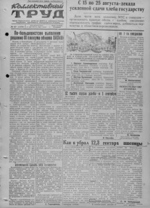 Пролетарии всех стран, соединяйтесь1 Юмие/сти&тй Орган Карасунекого райкома ВКП(б) и районного Совета депутатов трудящихся, Новосибирской области. № 62 (1170) ВОСКРЕСЕНЬЕ, 15 АВЕУСТА 1948 ГОДА Цена номера 15 копеек С 15 по 25 августа-декада усиленной сдачи хлеба государству Дело чести всех колхозов, М ГС и совхозов— организовать красные обозы с хлебом, ежедневно перевыполнять i рафик сдачи зерна, добиваться первенства в областном соревновании. ь пудов По-большевистски выполним решениеIII пленумаобкома ВКП(б) Недавно в Новосибирске состоялся II 1-й пленум обкома ВКН(б), на котором "был всесторонне обсуждён вопрос о хлебозаготовках из урожая 1948 года. В решениях пленума го ворится, что хлебозаготовки нынешнего года являются серьёзным экзаменом для партий ных и советских организаций нашей области. В таком же разрезе был поставлен вопрос и на районном собрании партийного актива, которое состоялось в Карасуке 11 августа. Участники собрания по-деловому обсудили доклад секретаря райкома ВКН(б) тов. Барбана- кова об итогах работы Л1-го пленума обкома и задачах районной партийной организации. Тов. Барбапаков в своём докладе отмстил, что хлеборобы нашего района самоотверженным трудом па колхозных и совхозных полях вырастили богатый урожай. Задача теперь заключается в том, чтобы убрать его во-время и без потерь, досрочно рассчитаться с государством но хлебопоставкам. — Август— -решающий месяц в хлебозаготовках, — сказал докладчик. К 1 сентября наш район должен выполнить не менее 50 проц. годового плана хлебозаготовок. Решению этой задачи надо подчинить всё: и косовицу, и обмолот, подработку, сушку и вывозку зерна на заготовительные пункты. Нельзя мириться с тем. что некоторые колхозы иод предлогом всевозможных причин срывают график хлебосдачи, а секретари партийных организаций этих зов не вникают в суть государству 2 миллиона сибирского хлеба. Выступающие в прениях от метили, что многие руководители колхозов и сельсоветов не чувствуют особой тревоги за судьбу урожая. — Колхозы нашей МТС, говорит директор Октябрьской МТС тов. Арсёнов,— убрали простыми машинами всего лини 3(3 гектаров. Все надежды возлагают на комбайны, необходимо включить вход все уборочные средства. Однако руководи тели колхоза «Культурный па харь», например, приостановили работу комбайна, оправдываясь тем, что хлеб якобы еще зе.п иый. Главный агроном районною отдела сельского хозяйства тов. Шишков в своем выступлении говорил о благодушии и беспечности руководителей колхо зов «'Культурный хлебороб», «Завет Ильича», «Вторая пятилетка» и некоторых других, которые в надежде на комбай * ГА ЕЖЕДНЕВНО Вступая в уборку урожая, молодые хлеборобы Петр Радченко и Павел Кугук из колхоза имени Сталина, Хорош «некого сельсовета, взяли обязательство скашивать конной лобогрейкой ежедневно по 7 гектаров вместо 4 по норме, а за за самоотверженный труд на уборке уро-~у\ 1$ дней убрать 100 гектаО /V V П Г Г Л / - * Г Т 1 I I P г . < ___ _ _ _ _ _ _ I _ _ _ _ _ _ _ i ? _ ih ЖАЯ И ХЛЕБОСДАЧЕ ГОСУДАРСТВУ РАЙКОМОМ ВКП(б) И РАЙИСПОЛКОМОМ НА РАЙОННУЮ ДОСКУ ПОЧЁТА ЗАНОСЯТСЯ: 1- М и х а и л П о н о м а р е н к о — комбайнер Хоро- шпнекой МГС. Комбайном «Сталинец» в колхозе «Память Ильича» убрал 140 га с хорошим качеством. Намолотил 1750 центнеров хлеба. 2; П е тр Т в е р д о х л е б - комбайнер Хорошииской МГС. Комбайном „Коммунар" в колхозе «Большевист