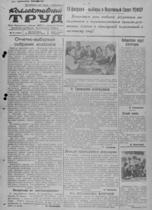 <jt£ i y d jo e T r t t r c r t f 6 и с й # 4 й Г п е * Я Пролетарии всех стран, соединяйтесь! УСЬиие/сггш£н$ш Орган Иарасунсного райнома ВНП(б) и районного Совета депутатов трудящихся, Новосибирсной области. М 9 (1434) ВОСКРЕСЕНЬЕ, 28 ЯНВАРЯ 1951 ГОЛА Цена номере 15 копеек 18февраля- выборывВреохвныСойветРСФСР Встретим день выборов досрочным выполнением и перевыполнением производственных планов и образцовой подготовкой к весеннему севу! Отчётно-выборные собрания Одной из важнейших хозяйственно-политических задач в борьбе за дальнейшее организационно-хозяйственное укрепление колхозов и повышение политической и производственной активности колхозников является проведение отчётных и отчётно-выборных собраний но итогам хозяйственной деятельности. На открытых собраниях колхозники подведут итоги своего труда за истекший год, всесторонне обсудят и оценят деятельность своих руководителей; смело вскроют недостатки и промахи; наметят конкретные пути умножения общественных богатств. В колхозах нашего района уже началось проведение отчётных собраний. На проходившем отчётном собрании сельхозартели «Путь Ленина» колхозники в своих выступлениях по докладу председателя тов. Ткаленко нанесли справедливую резкую критику по недостаткам работы правления артели. Отмечено, что правление колхоза односторонне и несистемно руководит общественным хозяйством, допускает компанейщн- ну. Вследствие этих причин колхоз не решил такой важнейшей задачи, как выполнение плана развития птицеводства. На отчётном собрании сельхозартели «Красное знамя» колхозники подвергли серьёзной критике работу правления артели. Работа ревизионной комиссии признана также неудовлетворительной. Для того, чтобы собрания прошли на высоком политическом и организационном уровне, прежде всего необходимо серьёзно составить отчёт правления, в котором детально осветить все стороны хозяйственной деятельности, вскрыть причины отставания той или иной отрасли хозяйства, показать лучших тружеников артели и их успехи в социалистическом соревновании. Ревизионная комиссия обязана подойти со всей строгостью к составлению заключения по отчёту правления артели. Для этого необходимо заранее провести тщательную ревизию, глубоко разобраться в делах каждого члена правления п колхозника, проверить, как соблюдается основной закон колхозной жизни— Сталинский Устав сельскохозяйственной артели. колхозов Необходимо, чтобы на отчётном собрании присутствовали руководители МТС, так как колхозники могут высказать ряд ценных предложений в адрес машинно-тракторной станции. Ли в коем случае не допус- кать, чтобы повестка собрания перегружалась другими посторонними вопросами, так как это смазывает остроту и значение в обсуждении основного вопроса. Очень важно, чтобы ии один колхозник не остался в стороне от обсуждения вопросов, жизненно-важных для колхоза и каждого труженика. Поэтому заранее необходимо решить вопросы, обеспечивающие присутствие на отчётном собрании абсолютного большинства членов артели. Районные работники, посылаемые для присутствия на отчётные собрания колхозов, должны выехать в них заранее, до проведения собрания; глубоко и всесторонне ‘ изучить положение артелей, образцово направить и провести собрание. Велика и ответственна роль в подготовке и проведении отчётных собр