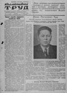 Пролетарии всех' стран, соединяйтесь! iCbU ueX c/nufcm ii Т Р У Д Орган Нарасунсного райнома ВНП(б) и районного Совета депутатов трудящихся, Новосибирсной области. ЧЕТВЕРГ , Цена н ом ер а № 10 (1 4 3 5 ) / ФЕВРАЛЯ 1951 ГОДА 15 коп еек Итоги минувшего года свидетельствуют о выдающихся успехах советской экономики и культуры, достигнутых нашим народом под руководством большевистской партии, под водительством Великого Сталина. тл\ л . - я п а п а ш н и Новый подъём народного хозяйства СССР Центральное статистическое Управление при Совете Министров СССР опубликовало сообщение об итогах выполнения государственного плана развития народного хозяйства СССР в 1950 году. Итоги минувшего года свидетельствуют о выдающихся успехах советской экономики и куль туры, достигнутых нашим пародом под руководством большевистской партии, под водительством Великого Сталина. Годовой план производства валовой продукции за 1950 год выполнен в целом по промышленности на 102 процента. Валовая продукция всей промышленности СССР в 1950 году выросла по сравнению с 1949 годом на 23 процента. Сверх годового плана произведено значительное количество угля, нефти, бензина, керосина, электроэнергии, чугуна , стали, проката, машин, оборудования, товаров массового потребления и другой важнейшей продукции промышленности. В прошлом году для основных отраслей народного хозяйства отечественная промышленность дала более 400 новых типов и марок высокопроизводительных машин и механизмов. Новые успехи достигнуты в деле дальнейшего подъёма социалистического сельского хозяйства. Валовой урожай зерновых культур в 1950 году составил 7 миллиардов 6 0 0 миллионов пудов. Задание но урожайности зерновых культур, установленное пятилетиям планом на 1950 год, выполнено с превышением. Валовой урожай хлопка достиг 3 миллионов 750 тысяч тонн, превысив задание пятилетнего плана на 1950 год на 650 тысяч тонн. Валовой урожай сахарной свёклы превысил урожай 1949 года на 1 миллион 200 тысяч тонн. Значительно выросла и окрепла материально- техническая база сельского хозяйства. Социалистическая промышленность дала селу более 180 тысяч тракторов (в переводе на 15-ти сильные), 46 тысяч комбайнов (в том числе 23 тысячи самоходных), 82 тысячи грузовых автомобилей, свыше 1.700 тысяч прицепных орудий и других сельскохозяйственных машин. Увеличилось поголовье общественного скота в колхозах: крупного рогатого скота—на 10 процентов (в том числе коров— на 20 процентов), свиней —на 28 процентов, овец и ко з—на 13 процентов, лошадей— на 15 процентов. Поголовье птицы увеличилось на 44 процента. Успешно осуществляется грандиозный сталинский план преобразования природы. Подъём народного хозяйства привёл к дальнейшему росту материального благосостояния и культурного уровня трудящихся. Национальный доход СССР в 1950 году, в сопоставимых ценах, вырос по сравнению с 1949 годом на 21 процент. В результате снижения с 1 марта 1950 года цен на все товары массового потребления повысилась на 15 процентов реальная заработная плата рабочих и служащих и на 16 процентов снизились расходы крестьян на п о куп ку удешевлённых промышленных товаров. Доходы рабочих и служащих и доходы крестьян увеличились в 1950 году, в сопоставимых ценах, по сравнению с 1949 годом на 19 процентов.Значительно возросла продажа промышленных п продовольственных товаров для населения. Численность ра