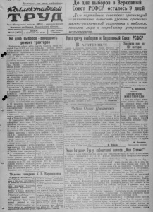 Пролетарии всех стран, соединяйтесь! iC b u a £ & rn u 6 H 6 U / Т Р У Д Орган Нарасунсного райнома ВНП(б) и районного Совета ЧЕТВЕРГ, Цена номера М 12 (1437) 8 ФЕВРАЛЯ 1951 ГОЛА 15 копеек Ко дню выборов -завершить ремонт тракторов Приближение выборов в Верховный Совет РСФСР всё более и более вызывает подъём соци- и^ллистического соревнования на £ f V n c e x предприятиях, во всех колхозах, МТС и совхозах на- * * шего района. Как к большому радостному празднику готовятся труженики сельского хозяйства, стремясь ознаменовать выборы новыми производственными победами. Горя желанием встретить день выборов в Верховный Совет РСФСР высокими производственными показателями, коллективы машинно-тракторных станций нашего района приняли на себя ответственные обязательства— завершить ремонт тракторов и прицепных сельхозмашин к 18 февраля. Механизаторы Карасукской и Студёновской МТС широко развернули социалистическое ^соревнование за осуществление ^ Ц ф н н я т ы х обязательств. Но со- стоянию на 1 февраля в этих станциях отремонтировано около 70 процентов тракторного парка, а ремонт прицепного сельхозинвентаря подходит к концу. Нетерпимое положение с ремонтом тракторного парка и прицепного сельскохозяйственного инвентаря в Хоропшн- ской и Чёрно-Курьпнской МТС. В Хорошинской МТС отремонтировано всего лишь 37 процентов тракторного парка. За январь из ремонта выпуще-1 но только 4 трактора, Чёрно- Курьинская МТС в январе из ремонта выпустила 5 тракторов и не отремонтировала в течение месяца ни одного тракторного плуга, ни одной сеялки. Но непонятным причинам в январе резко снизила темпы ремонта по сравнению с четвёртым кварталом 1950 года Октябрьская МТС. Она выпустила из ремонта только трп трактора из 0 установленных заданием. Произведённая проверка качества ремонта тракторов и сельскохозяйственных орудий показала, что в МТС нет ещё должной борьбы с бракодельством, отсутствует строгий контроль за качеством ремонта, в результате чего вышедшие из До дня выборов в Верховный Совет РСФСР осталось 9 дней Долг партийных, советских организаций —решительно повысить уровень организационно-технической подготовки к выборам, принять меры к скорейшему устранению недостатков. Навстречу выборам в Верховный Совет РСФСР ремонта тракторы имеют значительные дефекты. Низкие темны ремонта машинно-тракторного парка, прицепных сельскохозяйственных машин и плохое качество имеют место потому, что директора Хорошинской, ' Чёрно-Курьинской и Октябрьской МТС и их заместители по политчасти не приняли конкретных мер для мобилизации своих коллективов на устранение неполадков в организации ремонта тракторов, не установили строгого повседневного контроля за выполнением установленного графика, не привили чувство ответственности ремонтным рабочим за не выполнение задания. Областной комитет партии поставил как важнейшую задачу перед партийными организациями МТС— быстрейшее завершение подготовки к весеннему севу, а это значит, преждеъсего, своевременно и высококачественно отремонтировать машинно-тракторный парк. Директорам МТС и их заместителям но политчасти требуется создать все необходимые условия ремонтным рабочим, обеспечивающие выполнение взятых обязательств по завершению ремонта тракторов и прицепного сельскохозяйственного инвентаря ко дню выборов в Верховный Совет