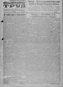 Пролетарии всех стран, соединяйтесь! iCbuuetomuSHmi Орган Иарасунсного райнома ВНП(б) и районного Совета депутатов трудящихся, Новосибирсной области. АА i h i i a a i A ЧЕТВЕРГ, Цена номера As 10 { 1 4 4 1 ) I 22 ФЕВРАЛЯ 1951 ГОЛА 15 копеек Завтра—33-я годовщинаСоветской Армиии Военно-Морского Флота Пусть живут и крепнут на радость трудящемуся человечеству Вооружённые Силы СССР! Да здравствует наш великий вождь и любимый учитель, гениальный полководец товарищ Сталин! «Правда» Настраже мира ибезопасности а т * СТ| А г Завтра исполняется 33 года со дня рождения Советской Армии и Военно-Морского Флота. Советский народ с гордостью чествует свои Вооружённые Силы за беззаветное служение социлистическому Отечеству, за не- ушимую верность Родине и де- у партии Ленина—Сталина, за победоносную защиту Советского государства от иноземных захватчиков. Советский народ отмечает 33-ю годовщину своих Вооружённых Сил в обстановке мощного политического и трудового подъёма, приносящего всё новые и новые успехи в борьбе за победу коммунизма. Эти успехи воодушевляют советских воинов в их боевой и политической учёбе, в овладении новыми высотами военного искусства. Советский народ, радуясь растущей мощи своих Вооружённых Сил, знает, что эта мощь служит самой верной и надёжной защитой его мирного труда, является порукой от всяких случайностей и неожиданностей, даёт ему возможность неуклонно претворять в жизнь великий сталинский план строительства коммунизма. 28 января 1918 года В.И. Ленин дписал декрет об организации абоче-Крестьянской Красной Армии. С первых же дней своего существования Красная Армия подверглась тяжёлым испытаниям. Германские империалисты напали на молодую советскую республику. Немецкие хищники ставили своей целью уничтожить советскую власть, превратить нашу страну в свою колонию. Молодые отряды Красной Армии героически отражали натиск вооружённых до зубов германских войск и в сражениях под Нарвой и Псковом 23 февраля 1918 года разгромили кайзеровские отборные дивизии. День этот славной победы—23 февраля 1918 года стал историческим днём рождения могучей Красной Армии, армии нового типа. Опираясь на поддержку всех трудящихся нашей страны, Красная Армия разгромила одного з а\ другим царских генералов, разбила армии интервентов—Герма- нии, США, Англии, Франции, Японии, белофиннов и других, отстояла великие революционные завоевания нашего народа. Товарищ Сталин был непосредственным вдохновителем и организатором побед Красной Армии в годы гражданской войны и интервенции. С именем великого полководца революции связаны самые славные победы нашей Красной Армии. Уже тогда, в годы гражданской войны Советская Армия получила основы советской военной науки, которые были разработаны и применены товарищем Сталиным. В годы мирного социалистического строительства Советская Армия не раз давала достойный отпор врагам, которые пытались напасть на советскую страну. Она проучила японских захватчиков у Хасана и Хал-Хннгола, выполнила свой долг перед Родиной в войне с белофинскими захватчиками. Тяжёлым испытанием для со ветского народа и его Вооружённых Сил явилась Великая Отечественная война. Вскормленные и вспоенные американскими монополиями гитлеровские орды вероломно напали на Советский Союз. К этому нападению гитлеровская Германия готовилась давно, поль