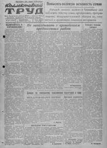 Пролетарии всех стран, соединяйтесь! iCbuuekmu&mti Орган Карасуксного райнома ВНП(б) и районного Совета депутатов трудящихся, Новосибирсной области. №25 (1450) ВОСКРЕСЕНЬЕ, 25 МАРТА 1951 / ОДА Цена номера 15 копеек Повыситьполевую всхожесть семян Каждый колхоз должен в ближайшие дни закончить очистку семян, организовать протравливание, воздушно-тепловой обогрев их, готовиться к яровизации семенных материалов ВКЛЮЧАЙТЕСЬ В СОРЕВНОВАНИЕ! л * Укрупнение колхозов открыло широкие перспективы для более производительного использования техники и повышения культуры земледелия. Все старания хлеборобов и механизаторов на- равлены сейчас на то, чтобы амного поднять урожайность артельных полей и этим самым с честью решить задачи, поставленные партией и правительством перед сельским хозяйством. В нашей области инициатором движения за более лучшее использование машин, за сокращение сроков нолевых работ и повышение их качества выступила тракторная бригада Героя Социалистического Труда С. Хоронь- ко из Заобской МТС. Она обязалась за сезон выработать но 1.000 гектаров мягкой пахоты на один пятналцатисильный трактор, каждую одиннадцатую смену работать на сэкономленном горючем, на ремонте и техуходе сэкономить 20 тысяч рублей, вырастить урожай по 120 пудов с гектара. Этот патриотический почин первыми подхватили в нашем ^^районе тракторная бригада тов. ^Вкошелева из Карасукской МТС полеводческая бригада тов. Смакотина колхоза имени Тельмана. Их примеру последовали трактористы бригады тов. Гайдай и хлеборобы первой полеводческой бригады этого же колхоза. Тракторные бригады т. т. Кошелева и Гайдай в содружестве с хлеборобами обещают работать в две смены, по часовому графику, посев произвести в самые сжатые сроки с применением гранулированных удобрений, организовать хороший уход за растениями; приложить все силы к тому, чтобы получить 100-пудовый урожай. Соревнование разгорается. Почётные обязательства взяли на себя тракторная бригада тов. Миненко из Студёновской МТС и колхозники сельхозартели имени Сталина. Они обещают добиться в этом году 90-100-пудового урожая с одного гектара. Руководство соревнованием механизаторов и колхозников за лучшее использование техники, за высокий урожай должно стать в центре внимания партийных и комсомольских организаций. Ни один тракторист, сеяльщик, прицепщик, полевод не должен оставаться в стороне от этого благородного движения. Следует повседневно проверять выполнение взятых обязательств, пе- ренимать опыт передовиков. В прошлом году в нашем районе было широко развёрнуто социалистическое соревнование по примеру тракторной бригады тов. Юнакова. Оно принесло значительные успехи. Немало бригад добились выработки свыше 700 гектаров, а бригада тов. Самойленко из Хорошинской МТС сделала 864 гектара на 15- сильный трактор. Партийные и комсомольские организации, сельские Советы, руководители МТС, колхозов и совхозов должны всеми средствами помогать соревнующимся, ширить их ряды. В оставшиеся до выезда в иоле дни надо ликвидировать все недостатки в подготовке к севу, создать хорошие культурно-бытовые условия для полеводов и механизаторов. Товарищи механизаторы и полеводы! Смелее включайтесь в социалистическое соревнование за получение стопудового урожая в 1951 году! } Не запаздывать с проведением предпосевных работ Перве