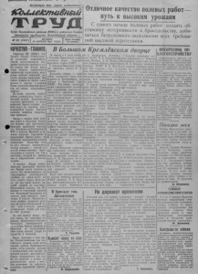 V С Л И Л г Г I ' Пролетарии всех стран, соединяйтесь! ХЬииекхпивнбШ Орган Нарасунсного райнома ВНП(б) и районного Совета №32 ( 1457) ЧЕТВЕРГ, Цена номера 19 АПРЕЛЯ 1951 ГОДА 15 копеек Отличное качество полевых работ— путь к высоким урожаям С самого начала полевых работ создать обстановку нетерпимости к бракодельству, добиваться безусловного выполнения всех требований высокой агротехники. КАЧЕСТВО-ГЛАВНОЕ Секретарь ЦК ВКП(б) тов. Хрущёв говорил: «Сейчас нельзя руководить кампанейски, нельзя довольствоваться знаниямиотдельных приёмов ит.п. На очередь дня во-всю ширь стали вопросы комплексного применения агротехники, внедрения наиболее передовой, научной системы земледелия. Мы сейчас должны не просто защищаться от засухи, а должны будем наступать широким фронтом, всё смелее переделывать природу». На полях колхозов нашего района развернулась борьба за высокий урожай. Большинство колхозов, тракторных и полеводческих бригад полевые работы ведут на высоком агротехническом уровне. Высокое качество является непреложным правилом. Однако с первых дней нолевых работ в отдельных колхозах вскрыто ряд недостатков. Бригадир тракторной бригады тов. Рассказов изСтудёновской МТС в колхозе «Красный пути- ловец» допустил нарушение в огротехнике. Вместо плуга за колёсным тракторомбыл пущен лущильник. Вследствие чего на двух гектарах произведена мелкая вспашка с плохой заделкой концов массива. Здесь находился и агроном тов. Гор- пинченко, который не принял мер к нарушителям качества пахоты. В колхозе «Новая семья» бригадир тракторной бригады тов. Винник плуги включил в пахоту без предплужников, не отрегулировал равномерность глубины, на одном плуге не было заднего колеса. Безусловно, что при такой «пахоте» высокий . урожай не получишь. Председатель колхоза тов. Коваленко н участковый агроном тов. Подлужный бракоделам не сделали даже никакого замечания. В колхозе «Пятилетка» посев рыжика произвели вручную но плохо обработанной почве, хотя в колхозе имеется специальная сеялка для посева этих культур. Из этих фактов можно сделать вывод, что некоторые агрономы, председатели колхозов, бригадиры полеводческих и тракторных бригад контроль за качеством не осуществляют, этим самым наносят ущерб государству и колхозам. Весна вступила в своп права. Тёплые солнечные дни способствуют полным ходом вести полевые работы. Приближается время, когда колхозы вступят в решительный этап борьбы за высокий урожай—массовый сев. Задача заключается в том, чтобы сев провести в лучшие агротехнические сроки с высоким качеством, не допустить; малейших нарушений агротех-! НИКИ. I В Большом Кремлёвском дворце 14 апреля в G часов вечера, в Большом Кремлёвском дворце состоялось второе заседание Верховного Совета РСФСР. С докладом Мандатной комиссии выступил депутат И. Т. Гришин. Докладчик говорил о. новой победе сталинского блока коммунистов и беспартийных на выборах в Верховный Совет РСФСР. Эта победа является ярким свидетельством дальнейшего укрепления морально-политического единства нашего народа и его сплочённости вокруг большевистской партии, вокруг великого Сталина. Бурными долго несмолкающими аплодисментами встретили депутаты и гости эти слова. В Верховный Совет РСФСР избраны передовые люди социалистической промышленности и сельского хозяйства, деятели на