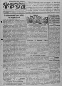 Пролетарии всех стран, соединяйтесь! iCbuue&nu&iMi Орган Нарасунсного райнома ВНП(б) и районного Совета депутатов трудящихся, Новосибирсной области. № 34 (1459 ) I 26 л п р е л я ^951 года Цена номера 15 копеек Агитационно-массовая работа на вееснемсеве В колхозах, совхозах и МТС| наступил один из важнейших ‘ этапов—период весеннего сева. Проведение весеннего сева в сжатие агрономические сроки и с высоким качеством работ— важное условие получения высокого урожая. Партийные организации должны обратить особо важное внимание на решение этой задачи, используя силу и действенность агитационно-массовой работы среди колхозников, рабочих МТС и совхозов. Парторганизации колхозов имени Тельмана (секретарь топ. Пи- кин), «Вперёд к коммунизму» (секретарь тов. Обухов), имени Дзержинского (секретарь тов. Черненко) и другие с первых дней весенне-полевых работ развернули массово-политическую работу среди колхозников и механизаторов непосредственно в тракторных вагончиках, полевыхстанах и на других участках работы. Нолевые станы и тракторные вагончики в этих колхозах хорошо оформлены наглядной агитацией, призывающей к успешному проведению весеннего сева. В колхозе имени Тельмана на нолевых станах оборудованы красные уголки, где можно почитать свежие газеты, художественную литературу, культурно отдохнуть после рабочего дня. Агитаторы т. т. Герасименко, Приходько, Котова и другие часто бывают на закреплённых участках. Они читают газеты, проводят беседы, выпускают «боевые листки», отражающие ход весенне-полевых работ в бригадах. Члени лекторской группы, руководит которой тов. Лобанов, часто выступают перед колхозниками с лекциями. Для обслуживания колхозников н механизаторов в период весеннего сева создана агитхудожественная бригада. В парторганизациях колхозов «Путь к коммунизму», имени Тельмана и других перед началом весеннего сева проведены семинары агитаторов, на которых были поставлены конкретные задачи. Комсомолец тов. Сердюк, работая учётчиком вбригаде тов. Шаповалова, регулярно знакомит механизаторов с последними новостями, читает художественную литературу. За последние дни он обсудил с трактористами итоги выполнения пятилетиего плана. Бригадир Комсомольске - молодёжной бригады тов. Литов- ченко в свободное от работы время среди механизаторов читает художественную литературу. Так, за последнее время он прочитал книгу Ильенкова «Большая дорога». Однако агитколлективы колхозов, совхозов и МТС ещё не полностью используют все методы агитационно-массовой работы среди колхозников, мало привлекают для работы среди населения сельскую интеллигенцию. Руководители агитколлективов должны построить работу агитаторов так, чтобы на всех участках в колхозе регулярно читались газеты, проводились беседы, лекции и доклады, читались лучшие произведения из художественной литературы. Необходимо добиться такого положения, чтобы вближайшее время все агитаторы провели беседы по итогам выполнения послевоенного нятилетнего плана. Бригада должнастать центром массово-политической работы на весеннем севе. Руководителям агитколлективов необходимо организовать среди колхозников и механизаторов соцсоревнование. Через агитаторов освещать проверку выполнения взятых обязательств и обозрение—через доски показателей и стенную печать. Партийные ор