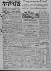 I l f ) U / l v r n u f J U U o U u л L r r i f j u r t , l i u c u u n n u u i v b o : iC fa u e Jc m u S H S U i Орган Карасуксного райнома ВИП(б) и районного Совета депутатов трудящихся, Новосибирсной области. №39 (1464) ВОСКРЕСЕНЬЕ, 13 МАЯ 1951 ГОДА Цена номера 15 копеек Завершим сев к 15 мая! Колхозы имени Дзержинского и имени Андреева полностью выполнили план весеннего сева. Равняйтесь на передовиков! Завоюем первенство в соревновании с андреевцами! Новые успехи в развитии народного хозяйства Опубликовано сообщение Центрального Статистического Управления при Совете Министров СССР об итогах выполнения Государственного плана развития народного хозяйства СССР на 1951 год за нергый квартал. Советский народ под руководством партии Ленина-Сталина добился новых выдающихся успехов в развитии социалистической экономики. Но пути дальнейшего подъёма идёт мощная советская индустрия, выпуск валовой продукции которой в прошлом году на 73 процента превысил уровень довоенного 1940 года. Квартальный план производства валовой продукции выполнен в целом по промышлен* ности на 100,2 процента. Валовая продукция всей промышленности СССР в первом квартале 1951 года выросла по сравнению с первым кварталом 1950 года на 18 процентов. Значительные успехи в раз витии социалистического сельского хозяйства. В этом году совхозы, МТС и колхозы приступили к весенним полевым работам ещё более оснащёнными техникой, чем в 1950 году. В Южных районах страны успешно закончен сев колосовых культур, развернулся сев яровых культур в районах средней полосы. Яровой сев проходит в более сжатые сроки: на 5 мая посеяно яровых куль тур на 2,5 миллиона гектаров больше, чем на ту же дату в прошлом году. На 1 мая посадки и посевы защитных лесонасаждений произведены на площади 700 тысяч гекта- ров— на 55 тысяч гектаров больше, чем на 1 мая прошлого года. Данные о росте государственной и кооперативной торговли, о расширении товарооборота в городе и деревне наглядно свидетельствуют о неуклонном улучшении благосостояния советского народа. В первом квартале 1951 года продолжалось дальнейшее развёртывание советской торговли. Проведённое, с 1 марта 1951 года по решению Советского правительства п Центрального Комитета ВКП(б) новое— четвёртое по счёту— снижение государственных розничных цен на продовольственные и промышленные товары массового потребления вызвало значительное увеличение продажи товаров в государственной п кооперативной торговле. В марте 1951 года ежедневная продажа товаров по сравнению с февралём этого года, в сопоставимых ценах, увеличилась в среднем на 19 процентов. Снизились цены на колхозных рынках. Победа завоёвана Колхоз имени Андреева самый крупный в нашем районе. Только зерновых культур он сеет 6.500 гектаров. 10 мая хлеборобы этой артели одержали крупную победу — полностью выполнили план весеннего сева, основной культуры— пшеницы посеяно5.150 гектаров. Кроме этого посеяно около 200 гектаров рыжика, 280— подсолнечника, 225 гектаров многолетних трав и другие культуры. Основа богатого урожая заложена. Хлеборобы артели в тесном содружестве с механизаторами борются в этом году за получение стопудового урожая Успех весеннего сева решили механизаторы Хорошинской МТС. Хорошо трудились колхозники, обслуживающие тракторные бригады. Они без задержки подвозили семена и засыпали их на ходу в сеялки, своевременно доставляли горюч