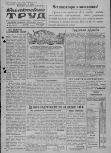 Новосибирск проспект Сталина х Областная библиотека I экз. Пролетарии всех стран, соединяйтесь! iCbuuefcmu&mu Орган Нарасунсного райнома ВНП(б) и районного Совета деп у та тов трудящихся, Новосибирсной области. № 40 (1465) ЧЕТВЕРГ, /7 МАЯ 1951 ГОДА Цена номера 15 копеек Механизаторы и колхозники! Сроки сева прошли. Для того, чтобы преодолеть отставание, надо утроить темпы полевых работ, полнее использовать технику и живое тягло. Все силы на завершение весеннего сева! * ВСЕ СИЛЫ НА ЗАВЕРШЕНИЕ СЕВА! ХлеОоробы и механизаторы хорошо понимают, что чем быстрее и лучше проведут сев, -тем богаче будет урожай. В нашем районе с каждым днём уЩ множатся ряды передовиков весеннего сева. Растёт число колхозов и полеводческих бригад завершивших сев всех зерновых культур и продолжающих сеять сверх плана. Тракторные бригады т. т. Минепко и Тро- фимец из Студеповской МТС, работая в тесном содружестве с хлеборобами, ещё 5 мая в колхозе имени Дзержинского закончили весенний сев. В сельхозартели вспахано уже более 120 гектаров паров. Успешно выполнили план весеннего сева механизаторы бригад т. т. Семенихина и Устименко из Октябрьской МТС. На 15 мая полностью завершили план J tceBa зерновых и технических ЩРкультур колхозы «Пятилетка», «Новый мир» и другие. Закончили также сев пшеницы колхозы имени Будённого, * «Вперёд к коммунизму», «Красное знамя». Успехи передовиков говорят о том, что каждый колхоз имеет возможность для проведения сева в более сжатые сроки. Однако темпы весенне- полевых работ в целом но району вызывают серьёзную тревогу. Сроки сева прошли, а во многих колхозах работы идут крайне медленно. Особенно затягивают сев колхозы, обслуживаемые Чёрно-Курьинской МТС. В сельхозартели имени Амангельды план сева яровых и технических культур выполнен только на 63,2 процента, пшеницы— на 80,3 процента. Колхозы «Новая семья» и «Жол Сталина» посеяли немногим больше половины плана. Отставание многих колхозов на весеннем севе ничем не оправдано. Оно объясняется толь- ко одним— отсутствием организованности. Директора МТС, правления колхозов и партийные организации не осуществляют должного контроля за работой тракторных и полеводческих бригад, мирятся с многочисленными простоями машин. Для примера можно взять Чёр- но-Курьинскую МТС, где значительная часть тракторного парка простаивает по техническим неисправностям. Для того, чтобы решительно преодолеть отставание надо утроить темпы полевых работ. Основная задача сейчас— в течение нескольких дней выполнить план сева, а там, где план выполнен, сеять сверх плана. Все силы на завершение сева! 1= ЗА с а м о о т в е р ж е н н ы й т р у д и высоки е ПОКАЗАТЕЛИ В СОРЕВНОВАНИИ НА ВЕСЕННИХ ПОЛЕВЫХ РАБОТАХ НА РАЙОННУЮ ДОСКУ ПОЧЁТА ЗАНОСЯТСЯ: 15. Колхоз «Пятилетна» (председатель тов. Петренко, секретарь парторганизации тов. Ш а манский). План сева яровых выполнил на 105,3 процента, пшеницы — на 115,2 процента и продолжает сев сверх плана. 16. Колхоз «Новый мир» (председатель тов. Чернобай, секретарь парторганизации тов. Бобровский). План сева яровых выполнил на 105 процентов, пшеницы— на 104,4 процента и продолжает сев сверх плана. 17. И. М. Паньно— тракторист МТС. На 15-сильный трактор за свои работал 188 гектаров мягкой пахоты 1 374 килограмма горючего. 18. И. П. Степанов— тракторист Карасукской МТС. На 15-сильный трактор за свои смены выработал 191 гектар мяг