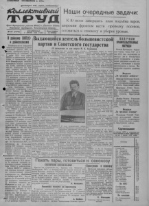иоластная оиолиотека I экз Пролетарии всех стран , соединяйтесь! iCouaeJcmuSHGUi Орган Нарасунсного райнома ВНИ(б) и районного Совета деп у та то в трудящихся, Новосибирсной области. № 45 (1470) ВОСКРЕСЕНЬЕ, 3 ИЮНЯ 1951 ГОДА Цена номера 15 копеек Наши очередные задачи: К 10 июня завершить план подъёма паров, широким фронтом вести прополку посевов, готовиться к сенокосу и уборке урожая. В райкоме ВКП(б) и райисполкоме Рассмотрев итоги соцналпсти веского соревнования на весен не-нолевых работах МТС, со ^ х о з о в , тракторных бригад и трактористов по состоянию па 1 июня 1951 года райком БКП(б) и райисполком победителем в соревновании признали Онтябрьсную машинно- тракторную станцию (директор тов. Хачко, заместитель директора по политчасти тов. Илюшин, старший механик тов. Орашак), выработавшей на 15- сильный трактор 257 гектаров мягкой пахоты и сэкономившей 377 центнеров горючего; план ларовспашки выполнен на 86,4 процента. За МТС оставлено переходящее красное знамя райкома ВКП(б) и райисполкома. Среди тракторных бригад первенство попрежнему удерживает бригада тов. Мисиюн Октябрьской МТС, выработавшая на 15-сильный трактор 377 гектаров мягкой пахоты, экономия горючего составляет 54 центнера. План паровепаш- ки выполнен на 100 процентов. За бригадой оставлено переходящее красное знамя райкома ВКП(б) и райисполкома. Отмечена хорошая работа тракторных бригад: тов. Семе- нихина из Октябрьской МТС, выработавшая на 15-сильный трактор 310 гектаров и сэкономившая 70,3 центнера горючего, план иаровсиашки выполнен на 220 процентов; тов. Швстанова из Карасукской МТС, выработавшая на 15- сильный трактор 35G гектаров мягкой пахоты и сэкономившая 21,2 центнера горючего, план иаровсиашки выполнен на 45,5 процента; тов. Вольная из ХорошинскоЙ МТС, выработавшая на 15-сильный трактор 338 гектаров мягкой пахоты н сэкономившая 35,3 центнера горючего, план паро- вепашкп выполнен на45проц . Среди совхозов первенство ^удерживает совхоз имени Дзер- минсного, выполнивший план подъёма паров на 90,4 процента. За совхозом оставлено переходящее красное 'знамя райкома ВКП(б) и райисполкома. Райком ВКП(б) и райисполком отметили хорошую работу на j весенне-полевых работах трактористов тов. Алтубаева из Октябрьской МТС, выработавшего на 15-снльный трактор 240 гектаров и сэкономившего 10 центнеров горючего; тов. Туманова пз этой же МТС, выработавшего на 15-сильный трактор 240 гектаров и сэкономившего 13,7 центнера горючего; тов. Гун пз Карасукской МТС, выработавшего за свои смены на тракторе «ХТЗ» ^ 4 0 гектаров и сэкономившего 4,8 центнера горючего. Выдающийсядеятельбольшевистской партии иСоветского государства (К пятилетию со дня смерти М. И. Калинина) Прошло пять лет со дня смер ти М. И. Калинина, одного из выдающихся деятелей коммунистической партии и Советского государства. Вся жизнь М. И. Калинина с юношеских лет неразрывно связана с борьбой большевистской партии под руководством В. И. Ленина и И. В. Сталина за дело трудящихся, за победу коммунизма. М. И. Калинин родился в ноябре 1875 года в семье крестьянина Тверской губернии (ныне Калининской области). 18-летним юношей он поступил в качестве рабочего на завод .Старый Арсе- нал“ в Петербурге, а позднее, через 2 года,—на Путиловский (ныне Кировский) завод токарем по металлу. В этот период М.И. Калинин включился в революционную работу нелегальных рабочих организаций. За револ