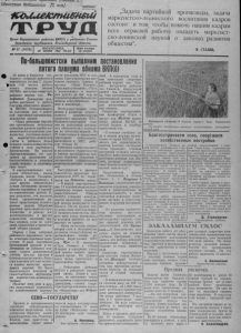 2. „Коллективный труд1 24 июня 1951 года, № 51 (1476) Образцово подготовим школы к новому учебному году С четвёртой сессии районного Совета Международный обзор Поражение итальянской реакции Проходившая в Карасуке четвёртая сессия [районного Совета депутатов трудящихся обсудила вопрос «Об итогах 1950- 1951 учебного года и подготовке школ к новому учебному году». С докладом выступила заведующая райОНО тов. Асеева. Анализируя работу школ за год, докладчик сказала: — По многих школах района учебно-воспитательная работа значительно улучшилась. Учебный материал государственной программы выполнен полностью. На уроках, кроме овладения основами наук, детям преподавались все качества нового советского человека: внимательность, любовь к труду, честность, бережливость в обращении с социалистическим имуществом, любовь к Родине и народу. Обучение детей у многих учителей велось на высоком идейно- научном уровне, связанным с задачами и интересами строительства новой жизни. Передовые учителя района и целые педагогические коллективы на деле доказывают возможность работы без второгодников и добиваются полной успеваемости учащихся. Но наряду с этим, говорит далее докладчик, мы имеем серьёзиыс недостатки в обучении и воспитании подрастающего поколения: незнание фактического материала изученных предметов, отсутствие практических навыков многих учащихся и т. д. Всё это объясняется недостаточной квалификацией отдельных учителей, недобросовестным отношением к своему делу. Некоторые учителя сами не подготовлены для того, чтобы учить детей. Вследствие этих и других причин мы имеем низкую успеваемость в отдельных школах. В Карасунекой средней школе успеваемость учащихся составляет всего лишь 49 процентов. Низкая успеваемость также в Хорошипской, Чёрно-Курыш- ской, Октябрьской и Кучугур- ской семплетних школах. В целом по району успеваемость учащихся за 1950-1951 год составляет только 70,2 процента. Далее докладчик говорит о подготовке школ к повому учебному году. Она обращает внимание участников сессии на то, чтобы во-время отремонтировать школьпые здания, инвентарь и квартиры учителей, полностью заготовить п подвезти топливо, отремонтировать имеющиеся и открыть новые интернаты, обеспечить школы учебно-наглядными пособиями, учащихся— учебниками и тетрадями, укомплектовать школы педагогпче- скимл кадрами. В прениях по докладу выступило 14 человек. Депутат тов. Литовченно сказал: — В Троицком сельсовете закон о всеобуче полностью не выполнен. Из посёлка Астра- дым школу должны были посещать 10 учащихся, а обучалось только 4 человека. Остальные дети из школы отсеялись потому, что правление колхоза «Красный путиловец» и руководители сельсовета не вели настоящей борьбы за выполнение закона о всеобуче. Далее тов. Литовчсико критиковал районный отдел народного образования за то, что он не обобщал лучший опыт работы передовых учителей я не распространял его среди школ района. Директор Чёрно-Курышской семилетней школы тов. Нинолаенно поднял вопрос о создании касс взаимопомощи при каждом колхозе и организации году расширить школу и не допускать больше трёхсменных занятий. Тов. Бобровсний— заведующий начальной школой колхоза «Новый мир», своё выступление посвятил финансированию школ. Он сказал, что Октябрьский сельсовет не профинансировал школу, день
