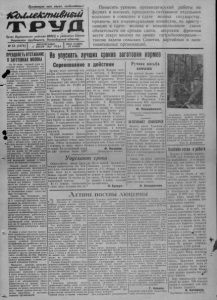 Пролетарии всех стран, соединяйтесь! iCbuue/cmuSHsUi Орган Нарасунсного райнома ВИП(б) и районного Совета депутатов трудящихся, Новосибирсной области. № 53 (1478) ВОСКРЕСЕНЬЕ, / ИЮЛЯ 1951 ГОДА Цена номера 15 копеек Повысить уровень организаторской работы на фермах и выпасах, преодолеть отставание отдельных колхозов и совхозов в сдаче молока государству, привлечь все индивидуальные хозяйства, не приступавшие к сдаче молока и невыполнившие своих обязательств по срокам сдачи, широким фронтом вести закуп молока по линии потребкооперации— такова задача сельских Советов, партийных и заготовительных организаций. ПРЕОДОЛЕТЬОТСТАВАНИЕ В ЗАГОТОВКАХ МОЛОКА На 20 июня годовой план заготовок молока колхозами, совхозами и индивидуальными хоз яй с т в ами нашего района выпол- на 37,4 процента. За этими ^^^редними показателями скрывает- позорное отставание в сдаче молока государству наших сов- VЛОЗОВ, выполнивших годовой ■г* план молокопоставок на 23,3 процента, отдельных колхозов и индивидуальных хозяйств, не приступивших к сдаче молока и не выполнивших своих обязательств в установленные сроки. Ни чем иным, как успокоенностью и беспечным отношением к повышению продуктивности коров и выполнению государственного плана молокопоставок, запущенностью организаторской работы на фермах можно объяснить тот факт, что одни колхозы, при равных условиях, сдают государству с фуражной коровы больше молока, другие— меньше. Так, колхоз имени Калинина (председатель тов. Переди- t pncHKo) от 241 коровы за 20 дней июня сдал государству 156,27 литров молока, что составляет по 8 литра на фуражную корову в день. Всего колхоз имени Калинина с начала года сдал по 235 '■^литров молока от фуражной коровы. Колхоз имени Жданова (председатель тов. Лебедев) за это же время от 124 коров сдал государству 11.806 литров молока или по 4,7 литра в день, а с начала года по 342 литра от каждой фуражной коровы в пересчёте на базисную жирность Низкий надой молока и не удовлетворительное выполнение плана сдачи молока государству в колхозе имени Калинина не тревожит председателя тов. Пе- редириенко и его заместителя тов. Николенко, на которою воз ложена вся полнота ответственности не только за выполнение государственного плана развития общественного поголовья, но и за выполнение плана сдачи молока государству. Однако тов. Николенко, как заместитель председателя колхоза и секретарь партийной организации не мобилизовал усилий работников животноводства на выполнение плана надоя и сдачи молока государству. Отсутствие должной организаторской работы среди колхозников, работающих на молочной ферме, привело к тому, что колхоз выполнил госу дарственный план молокопоста вок на 32 процента и не добился необходимого повышения надоя молока. В связи с этим уместно предъявить серьёзные претензии предсе дателю Нестеровского сельсовета тов. Маршеву, который не оказывает нужного руководящего воздействия на правление колхоза. Нестеровский сельский Совет принимает много решений по выполнению плана заготовок молока и других продуктов сельского хозяйства, но тов. Маршев и члены исполкома плохо организуют проведение в жизнь решений сельского Совета. Повысить уровень организаторской работы на фермах и выпасах, преодолеть отставание отдельных колхозов и совхозов в сдаче молока государсту, привлечь все индивидуальные хо