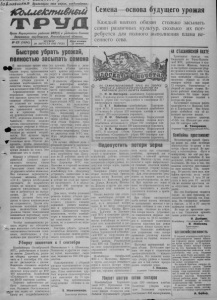 W W V. W 1 Пролетарии всех стран , соединяйтесь/ 4Cbuuejcmu6H6Ui Т Р У Д Орган Нарасунсного райнома ВНП(б) и районного Совета депутатов трудящихся, Новосибирсной области. № 69 (1494) ЧЕТВЕРГ, 30 АВГУСТА 1951 ГОДА Цена номера 15 копеек Быстрее убрать урожай, полностью засыпать семена В настоящее время важ- 'йшими задачами, стоящими перед тружениками сельского хозяйства, являются быстрейшее завершение уборки урожая и засыпка необходимого ко личества семян, потребного для весеннего сева 1952 года. Агрономическая наука и передовая практика учат, что высокое качество семян главным образом зависит от условий их выращивания, своевременной уборки, правильной подработки и хранения. Поэтому руководители колхозов, МТС, агрономы должны до биваться, чтобы каждая артель своевременно убрала ременные участки и обеспе- k ила себя собственными семенами до полной потребности. Веб лучшее зерно необходимо засыпать, на семенные цели. Нельзя до пускать, чтобы намолоченное зерно продолжительное время лежало на токах. Это приводит его к порче. Наряду с уборкой и подработкой следует организовать засыпку семян в подготовленные склады. Просушке семян также надо уделить особое внимание. Все сложные зерноочистительные машины «НИМ», «ОС-1», триера необходимо поставить на подработку семян; на каждую машину довести ежедневные задания и добиваться их выполнения. До 10 сентября семена должны быть очищены и сданы кладовщикам на сохранность. Делом обеспечения колхозов потребным количеством семян должны также повседневно заниматься партийные организации и сельские Советы Чтобы положительно решить задачу по обеспечению колхозов собственными высококачественными семенами, необходимо в ближайшие дни закончить уборку урожая. Однако в ряде колхозов уборка урожая идёт крайне медленно, что ведёт к неизбежным потерям зерна от осыпания. В колхозе «Красное знамя» некоторые комбайны работают плохо. Они часто простаивают по тех ническим неисправностям. В колхозе недавно был механик по комбайнам из Карасукской МТС тов. При- стяжнюк, но положение не изменилось. Поэтому и не случайно, что комбайнер тов. Засименко с начала страды убрал только 76 гектаров хлебов. 13 сельхозартели «Маяк Ильича» трое суток простоял сцеп двух комбайнов из за отсутствия учётчика-заправщика. Однако директор этой МТС тов. Ж у к надлежащих мер не принял. Не лучше обстоят дела с уборкой урожая в колхозах Студёновской МТС. В сельхозартели «Красный путило- вец» комбайнер тов. Дюсу- пов за 25 рабочих дней убрал только 32 гектара хлебов. Директор МТС тов. Неяскин и старший механик тов. Юрченко не помогли комбайнеру тов. Дюсупову устранить неполадки в машине. Вследствие чего она и сейчас по этой же причине простаивает. А в колхо зе ещё 800 гектаров неубранного хлеба. Для того, чтобы успешно решить задачу уборки урожая и засыпки семян необходимо уделить главное внимание работе комбайнов и зерноочистительных машин. Добиваться такого положения, чтобы комбайнеры и машинисты не только выполняли дневные задания, но и намного их перекрывали. Быстрее убрать урожай, полностью засыпать семена — неотложные задачи работников сельского хозяйства. Уборку закончим к 1 сентября Комбайнеры Октябрьской МТС, работающие в колхо зе имени Джамбула, решили уборку урожая закончить к 1 сентября. Их слова не расходятся с делом. Водитель степного к