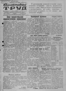 Врайкоме ВКП(б) ирайисполкоме Райком ВКП(б) и райисполком, рассмотрели итоги социалистического соревнования колхозов, МТС и совхозов, тракторных бригад и бригад по кормодобыванию на заготовке кормов и вспашке зяби по итогам работы на 10 сентября. Первое место в социалистическом соревновании занимает колхоз имени Калинина, выполнивший план накопления грубых кормов на 83,0 процента. За колхозом оставлено переходящее красное знамя райкома ВКП(б) и райисполкома, присуждённое ему по итогам работы на 20 июля. Второе место держит колхоз , Пятилетна " , выполнивший план накопления грубых кормов на 70,7 процента, закладки силоса— на 02 процента. Октябрьская МТС значительно лучше других машинно-тракторных станций ведёт заготовку грубых кормов, но она но- нрежнему отстаёт на вспашке зяби (выполнив план всего на 2 процента). Ввиду этого она потеряла право на присуждение ей первого места. Первое место среди МТС присуждено Чёрно-Курьинсной машинно-транторной стан- ции, выполнившей план вспашки зяби на 24,5 процента, заготовки грубых кормов— на 58,5 процента, закладки силоса— на 41 процент. За МТС оставлено переходящее красное знамя райкома ВКИ(б) и райисполкома, присуждённое ей но итогам работы на 31 августа. Хорошинская МТС медленно ведёт вспашку зяби и резко снизила темпы заготовки гр у бых кормов, хотя для улучшения работы она имеет все возможности. Прирост выполнения взмёта зяби за декаду составил всего 5,3 процента, накопления грубых кормов— 3,9 процента к плану. В результате низких показателей за истекшую декаду, она потеряла право на присуждение ей второго нестара успешную работу на заготовке кормов бригаде по кормодобыванию тов. Твердохлеб из Хорошинской МТС присуждено первое место. План сенокошения бригада выполнила на 252 процента, сэкономила 62,5 центнера горючего. За бригадой оставлено переходящее красное знамя райкома ВКИ(б) и райисполкома, присуждённое ей по итогам соревнования на 20 июля. Отмечена хорошая работа на заго/овке кормов машиниста самоходной сенокосилки тов. Дорош из Хорошинской МТС, скосившего 1.732 гектара трав и сэкономившего 731 килограмм горючего; тракторной бригады тов. Мисиюн из Октябрьской МТС, выполнившей план тракторных работ на 74 процента, выработка на 15- сильный трактор составляет 598 гектаров, сэкономлено 9.460 килограммов горючего Рай кем ВКП(б) и райисполком отмечают совершенно неудовлетворительную работу на заготовко кормов и вспашке зяби колхозов «Маяк Ильича», «Вперёд к коммунизму» и имени Сталина, давших п р т о с т за истекшую декаду по выполнению планов заготовки кормов и взмёта зяби от 3 до 4,5 процента. Плохо работает на заготовке кормов Карасукская МТС, давшая прирост за декаду 0,4 процента к плану. * Совхозы «Октябрь» и имени Дзержинского продолжают медленно вести заготовку кормов, закладку силоса и вспашку зяби. Райком ВКП(б) и райисполком призывают секретарей парторганизаций, председателей колхозов и сельских Советов, директоров МТС и совхозов шире развернуть социалистическое соревнование среди колхозников, рабочих МТС и совхозов за выполнение планов заготовки кормов и закладки силоса к 20 сентября, вспашки зяби— к 1 октября. Наш вклад в дело мира Благодаря повседневной п од д е рж ке и заботе партии и правительства х у д о ж е с т венная самодеятельность п о казывает блестящие р е зул ь таты мастерства народ