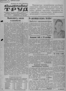 2. „Коллективный труд* 7 октября 1951 года, № 80 (1505) Инициатива и опыт В тракторной бригаде тов. Гайдай Одно из передовых мест в Карасукской машинно-тракторной станция занимает тракторная бригада Семёна Карповича Гайдай. Механизаторы бригады недаром пользуются заслуженной славой честных тружеников. Хорошо отремонтированные тракторы вывели весной члены бригады на колхозные поля. План весенних тракторных работ был выиолнен досрочно, с хорошим качеством. На вспашке паров механизаторы также показали образцы труда: пары были закончены 10 нюня. Неплохо потрудилась бригада и на уборке урожая. План уборочных работ она выполнила и во-время приступ ила к подъёму зяби. От заготовки земли под урожай будущего года зависит судьба нового урожая. Зная это условие, механизаторы добросовестно заготавливают зябь. Уже вспахано колхозу около 500 гектаров зяби. Несмотря на неблагоприятную" засушливую погоду, бригада тов. Гайдай делает всё возможное, чтобы зябь заготавливалась при соблюдении всех агротехнических правил. Большая роль в успешной рабо те на полях принадлежит бригадиру тов. Гайдай. Заботу о выполнении плана тракторных работ и о качестве работ тов. Гайдай сочитает с постоянной заботой о бытовых нуждах трактористов. Забота о трактористах, соблюдение правил технического ухода за машиной,— вот основные условия высоких показателей работы. Поэтому неудивительно, что тракторный вагончик у ппх хорошо оборудован, есть радио, газеты. В* вагончике всегда тепло, уютно. В брпгаде имеется хорошо благоустроенный вагончик-кухня, где принимают пищу механизаторы. Повариха Анна Потаповна Квитко пользуется заслуженной любовью всей бригады. Разнообразие меню, вкусно п во-время приготовляемая пища, чистота и уют— вот чем заслужила любовь механизаторов Анна Потаповна. Тов. Гайдай первый в районе построил вагончик-заправку. Заправка сделана из местных материалов, примерно так: на двух полозьях длиной 3,7 метра закреплено 6 вертикальных столбов (основание стен). Стены заплетены аккуратно тонкими прутьямч, умазаны глиной II затем побелены. Потолок сделан из фанеры. Двери открытые, двухстворчатые, для лёгкости также обитые фанерой. Заправочный вагончик легко передвигается со всем запасом горючего и смазочных материалов. Удобен он во многих 'о т ношениях. II горючее не испаряется от солнца, меньше оно загрязняется от пыли и грязи, и всё здесь на месте: дизель-топливо, лигроин, автол, нигрол и все заправочные приборы. Недавно на митинге посвящённом подписанию обращения! Всемирного Совета Мира, коллектив механизаторов решил к 10 октября закончить вспашку зяби, а также довести выработку на 15-спльный трактор до 600 гектаров. М. Токарев. Улучшить физическое воспитание молодёжи С цельюразвития массовой физкультуры на селе в нашей стране создано всесоюзное добровольное спортпвное общество «Колхозник*. Большинство колхозоз нашего района вступило в доброзольное общество. Хорошо работает коллектив добровольного спортивного общества колхоза «Пятилетка» (председатель совета коллектива тов. Дорофеев). Здесь члены коллектива аккуратно платят членские взносы, имеют плаа работы, систематически занимаются спортом. Став на вахту мира, комсомольцы и молодёжь решили построить физкультурную площадку. С этой целью совет добровольного спортивного общества организовал воск