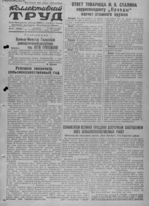 / Про ternipuu всех стран, соединяйтесь! iCbuueJcmu&iM i Орган Нарасунсного райнома ВИП(6) и районного Совета депутатов трудящихся, Новосибирсной области. № 81 (1506) V ЧЕ ТВЕРГ, ОКТЯБРЯ 19.51 Г г ДА Цена ном ера 15 коп еек Т е л е г р а мма Премьер-Министру Германской демократической республики Бэрпи». Ш| ОТТО ГРОТЕВОЛЮ В день национального праздника 2-н годовщины образования Германской демократической республики— прош у Вас, тов. Премьер-Министр, принять мои поздравления. Ж е лаю германскому народу, Правительству и Вам лично дальнейших успехов в деле строительства едино го, независимого, демократического, миролюбивого Германского государства. И. С та л и н Успешно закончить сельскохозяйственный год п # Под руководством партии Ленина-Сталина советский народ претворяет в жизнь величественную программу строительства коммунизма. Миллионы тружеников города и деревни встают на стахановскую ахту в честь Великого Октября. Призыв колхозников сельхозартели «Путь Октября», Усть- Таркского района о досрочном завершении всех сельскохозяйственных работ в честь 34 годовщины Октября нашёл горячую поддержку у колхозников нашего Карасукского района. ^ Обсуждая обязательства Усть- Таркскнх .‘хлеборобов, колхозники нашего района полны решимости трудиться, не покладая рук, на благо Родины. Вступая в предоктябрьское социалистическое соревнование, труженики полей берут на со бя социалистические обязательства— досрочно закончить все сельскохозяйственные работы текущего года. Члены сельхозартели имени Калинина одними из первых откликнулись на призыв колхозников артели «Путь Октября». Колхоз закончил уборку хлебов, картофеля и подсолнечника. На 90 процентов выполнен план заготовки кормов. Обсудив обязательство Устц- Таркских колхозников, члены артели решили включиться в предоктябрьское социалистическое соревнование, закончить к 20 октября заготовку кормов и ремонт животноводческих помещений. Хороших показателей добились члены сельхозартели имени Молотова. Здесь полностью очищены и засыпаны семена под урожай будущего года. Усиленно идёт подготовка к зимне-стойловому содержанию скота. Уже построены конюшня на 100-голов, два телятника на 200 голов, свинарник на 300 голов н птичник на 3 тысячи штук. Успешно завершают уборочные работы в колхозе «Вперёд к коммунизму» (председатель тов. Стремоухое). Здесь все семена очищены п засыпаны в эакрома. Около 1100 гектаров заготовлено зябп. Серьёзное внимание уделяется подготовке животноводческих помещений. В этом году* построены коровник на 100 голов, овчарник па 800 голов, телятник на 100 голов, птичник на 2.500 штук. Однако многие колхозы отстают в завершении сельскохозяйственных работ! В колхозе «Маяк Ильича» план накопления кормов выполнен только на 34,8 процента. Почти такое же положение в колхозах «Путь к коммунизму», пменп Тельмана и других. Медленными темпами в колхозах идёт подъём зяби. Так, колхозы, обслуживаемые Октябрьской МТС (директор тов. Хачко), выполнили план взмёта зяби только на 21 процент. В колхозе «Новый мир» (председатель тов. Чернобай) до сего времени не организовали очистку семян, свалив их в склад в неочищенном виде. Своевременное завершение всех сельскохозяйственных работ требует большого напряжения сил каждого колхозника и механизатора. Необходимо ещё шире развернуть социалистическое соревнование, о