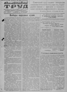 ( y U y v < A ^ e ^ ^ y ( ^ c a Пролетарии всех стран, соединяйтесь! iCbuuefcm uSHM i Т Р У Д Орган Нарасунсного райнома ВИП(б) и районного Совета депутатов трудящихся, Новосибирсной области. №- 87 (1512) ЧЕТВЕРГ, 1 НОЯБРЯ 1951 ГОДА Цена номера 15 копеек Советский суд служит интересам социалистического государства, неразрывно связан с народом и осуществляет его волю, выраженную в законах. (Из передовой „ Известий* за 28 октября 1951 года/. Выборы народных судов В печати Опубликован У ка з Президиума Верховного Совета РСФСР «О проведении выборов народных судов РСФСР». Выборы народных судов (народных судей и народных заседателей) в Носийской Федерации, ка к и в других союзных и автономных советских республиках, состоятся в декабре 1951 года. Подготовка и проведение выборов народных судов будут проходить в обстановке, когда трудящиеся нашей страны одержали замечательные успехи на всех участках коммунистического строительства. Иод руководством партии Ленина—Сталина советский народ успешно выполнил послевоенный пятилетний план и борется за дальнейший мощный подъём народного хозяйства и культуры. Осуществляя сталинскую программу строительства коммунизма в нашей стране, советские люди с огромным воодушевлением борются за быстрейшее сооружение великих строек на Волге и Днепре, на Дону и Аму- Дарье, преображают природу родной страны. 0 каждым годом растёт и укрепляется могущество великого социалистического государства-твердыни дружбы и славы народов Советской страны, несокрушимого оплота мира во всём мир; дням из важ- продииТоварищ Сталин учит;' что) иейших условий нашего успешного женин вперёд, к коммунизму, является всемерное укрепление Советского государства, органов государства. Советский суд являет- вшсэдттм из таких органов, важным средством охраны и дальнейшего укрепления социалистической законности и правопорядка. Подготовка и проведение выборов народных судов— большое политическое событие в жизни нашей страны. Советский суд служит интересам социалистического государства, неразрывно связан с народом п осуществляет его волю, выраженную в законах. Советский суд, отмечал Б. И. Ленин, есть орган привлечения трудящихся к управлению государством, орган власти трудящихся, орудие воспитания к дисциплине. Советское правосудие призвано защищать от всяких посягательств общественное п государственное устройство, установленное Конституцией СССР, социалистическую систему хозяйства и социалистическую собственность, права и интересы граждан, гарантированные законом. Наш суд воспитывает граждан в духе советского патриотизма и бдительности, в духе точного и неуклонного исполнения советских законов, бережного отношения к социалистической собственности, честного отношения к государственному п общественному долгу, уважения к правилам социалистического общежития. Наказывая виновных в нарушении законов, советский суд тем самым укрепляет Советское государство, действует в интересах всех трудящихся. Страна Советов—страна подлинно народной, социалистической домократип. Выражением социалистического демократизма и его расцвета, пронизывающего всю систему нашего государственного п общественного строя, являются, в частности, организация советского судопроизводства, выборность народных судей и народных заседателей. Закон о судоустройстве СССР об